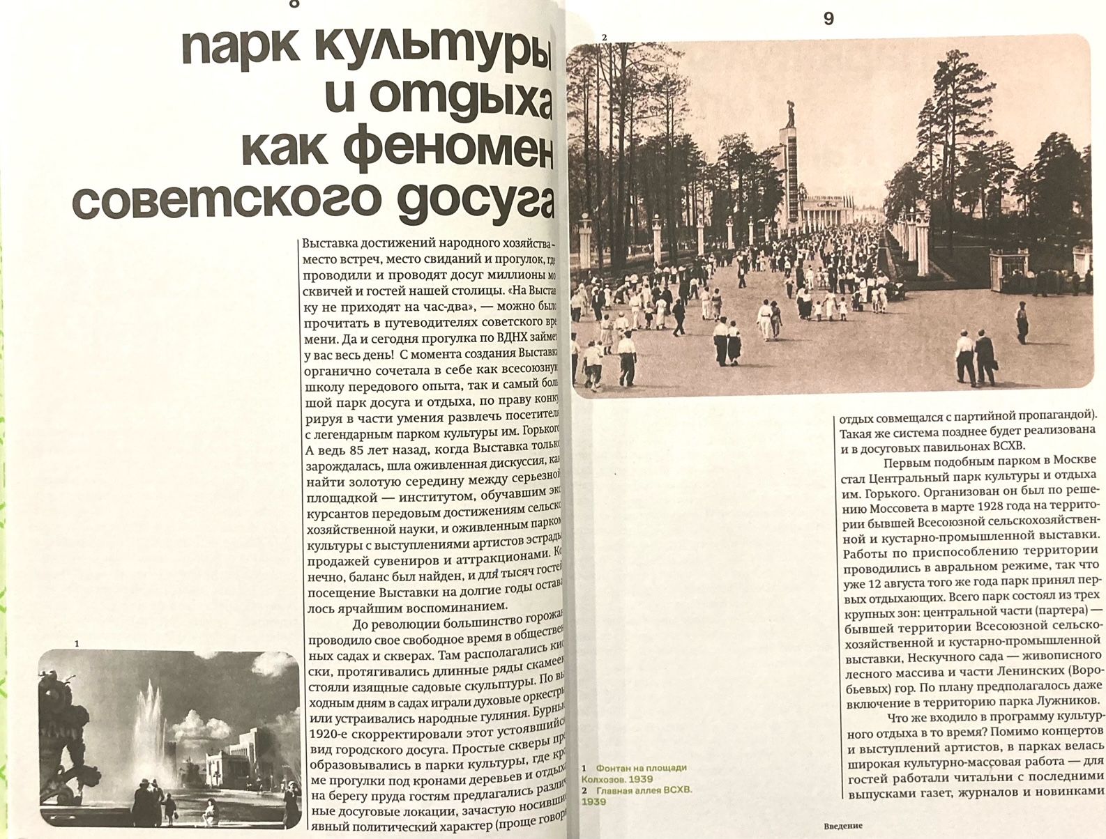 С первых лет работы Всесоюзная сельскохозяйственная выставка была не только «школой передового опыта» для трудящихся, как задумывалось изначально, но и любимым местом отдыха советских граждан — как жителей столицы, так и ее многочисленных гостей. Выставка стала не просто одним из «парков культуры и отдыха» Москвы: разнообразные площадки досуга, собранные здесь, считались образцово-показательными и должны были служить примером для всего Союза. Гости ВСХВ, а затем ВДНХ могли совершить умиротворяющую лодочную прогулку по зеркальным прудам или лихо прокатиться на аттракционах, созданных по последнему слову техники, побывать на концертах любимых артистов или увидеть веселое цирковое представление, пообщаться с животными на «охотничьей тропе» или полюбоваться восхитительным «зеленым нарядом» Выставки. Мельчайшие детали оформления, от цветочных композиций до росписи павильонов, складывались в единый сказочный ансамбль, который никого не мог оставить равнодушным. Ну а сохранить воспоминания надолго помогали разнообразные сувениры, созданные лучшими мастерами Союза.