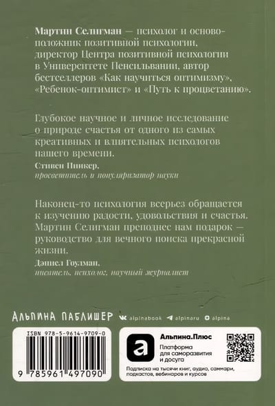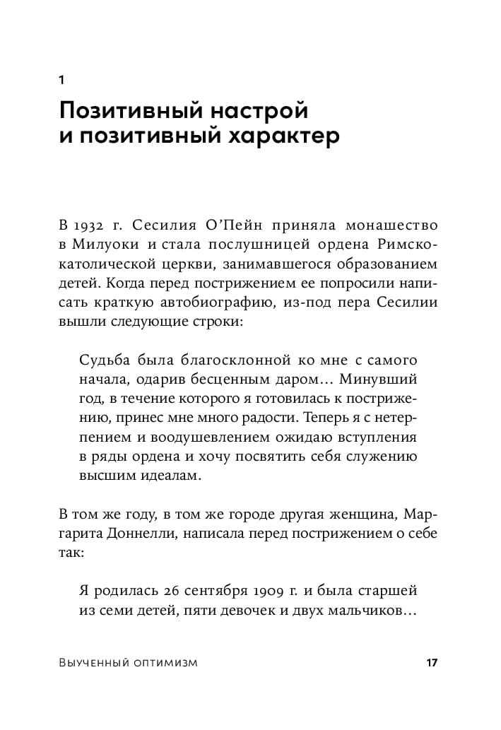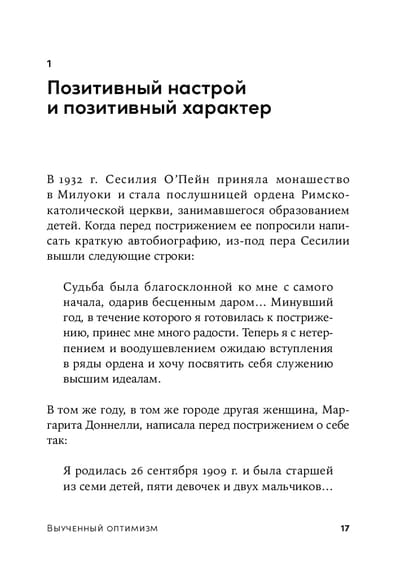Основоположник позитивной психологии Мартин Селинман в своей книге противопоставляет концепцию выученной беспомощности — состояния, при котором человек принимает отсутствие контроля над событиями, — идее выученного оптимизма, предполагающей активное формирование позитивного мировоззрения. Автор утверждает, что каждый в силах справиться с унынием, повысить устойчивость к стрессу, нужно только сосредоточиться на своих положительных сторонах, развивать их и проявлять каждый день.