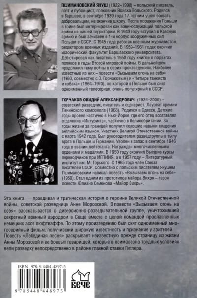 Эта книга — правдивая и трагическая история о героине Великой Отечественной войны, советской разведчице Анне Морозовой. В повести «Вызываем огонь на себя» рассказывается о диверсионно-разведывательной группе, уничтожившей секретный военный аэродром в Сеще вместе с целой командой прославленных немецких асов люфтваффе. По этому произведению был снят одноименный многосерийный фильм, получивший широкую известность и признание у зрителей. Повесть «Лебединая песня» раскрывает неизвестную прежде страницу из жизни Анны Морозовой и ее боевых товарищей, которые в неимоверно трудных условиях вели разведку непосредственно в районе главной ставки Гитлера.