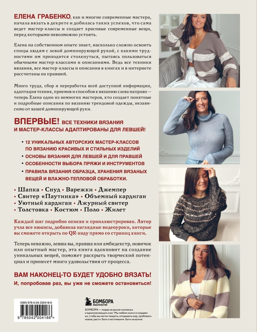 «Вязание стало для меня источником спокойствия и творчества. Я левша, но собирая по крупицам всю доступную информацию, мне удалось сломать систему, начав вязать слева направо. Сейчас я создаю описания стильных вязаных изделий как для правшей, так и для левшей. В этой книге я постаралась учесть все нюансы, чтобы сделать процесс вязания удобным и понятным каждому, независимо от доминирующей руки». — Елена Грабенко