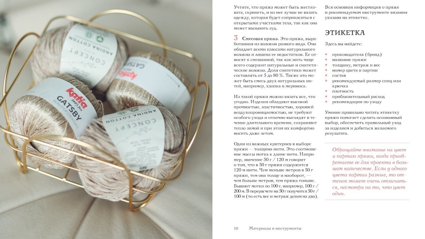 - Правила вязания образца, хранения вязаных вещей и влажно-тепловой обработки.