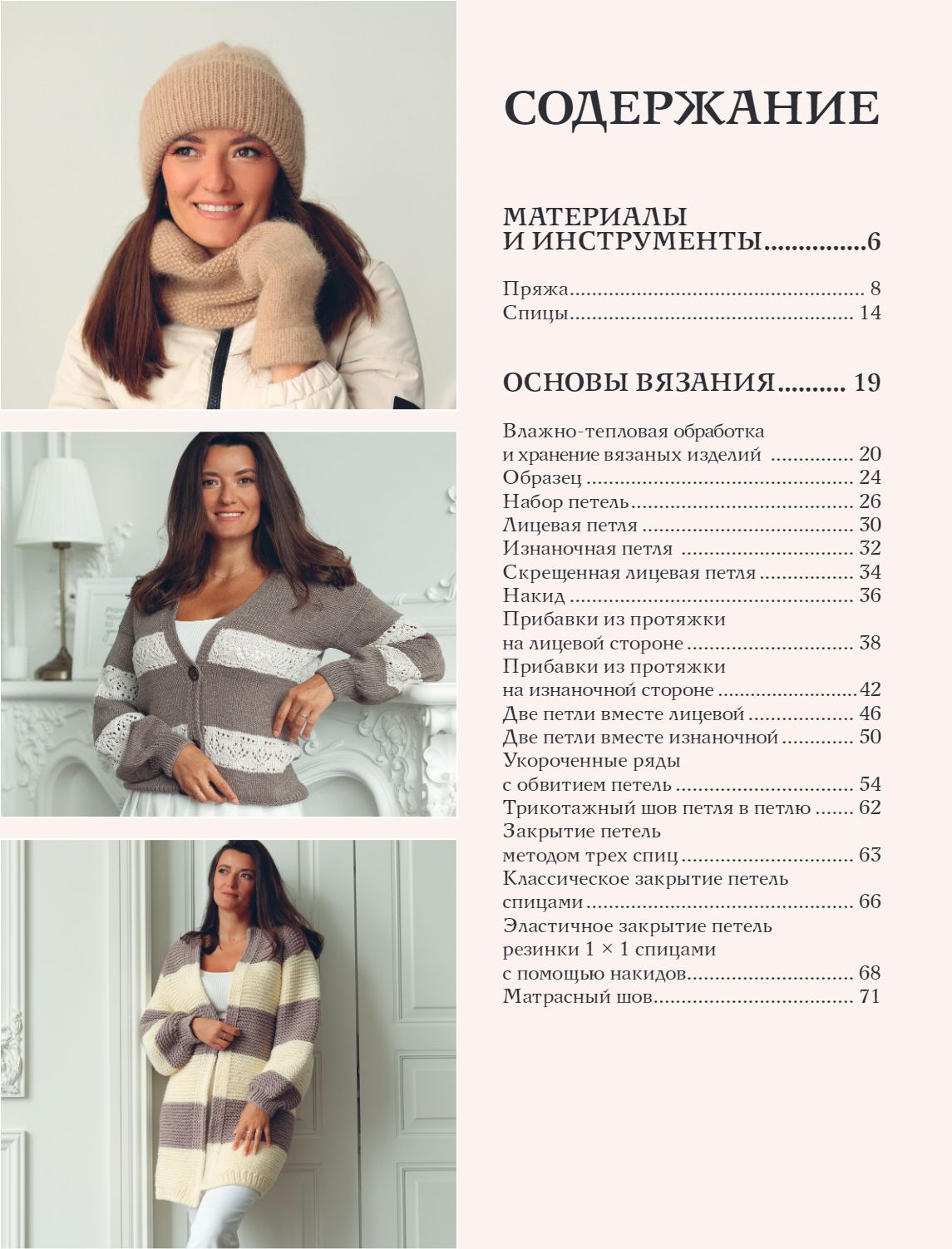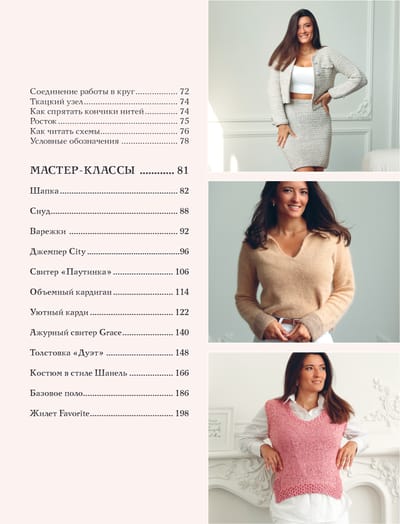 - 12 авторских мастер-классов: шапка, снуд, варежки, джемпер, свитер «Паутинка», объемный кардиган, уютный карди, ажурный свитер, толстовка, костюм, поло, жилет;
