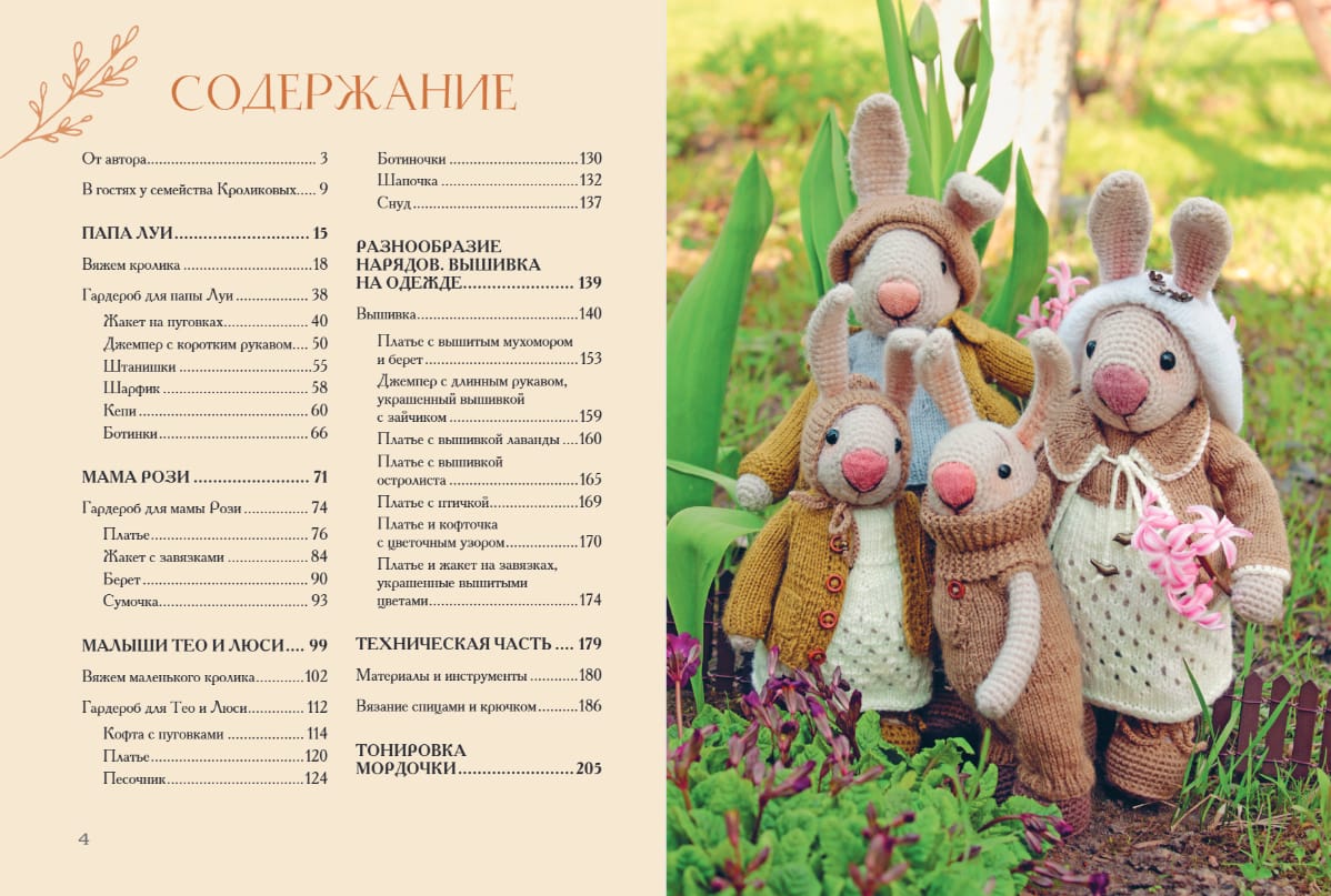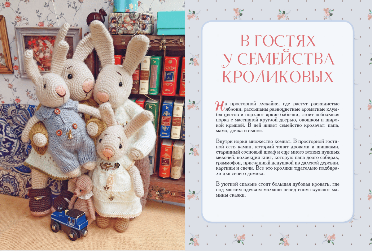 Милые, трогательные, смешные, теплые, связанные своими руками из натуральной пряжи, очаровательные кролики — Мама, Папа и двое крошек-крольчат, оживают на страницах книги чудесного мастера Дины Зверевой. Именно она придумала не только их самих, но и целый маленький и уютный мир, в который они приглашают вас погостить.
