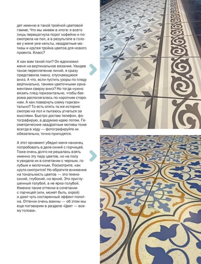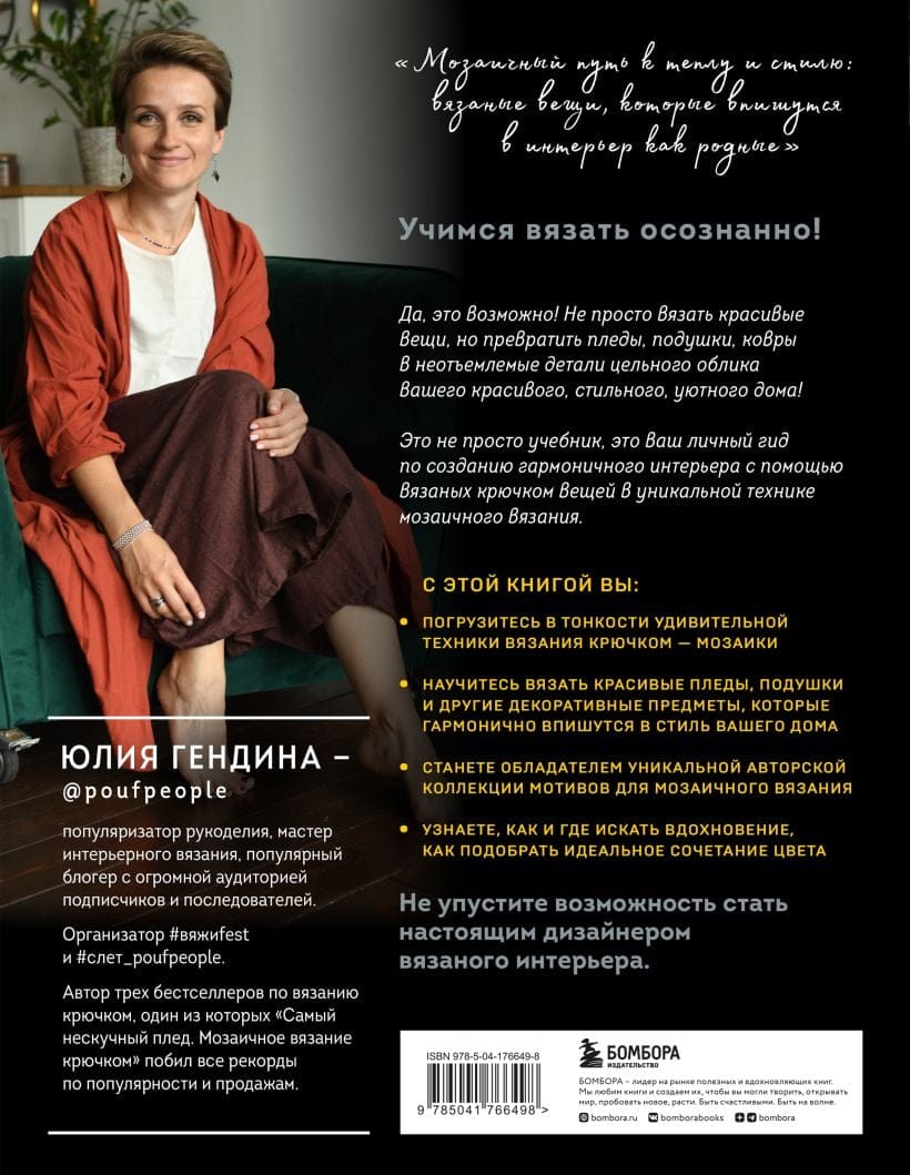 В новой книге популяризатор рукоделия и автор бестселлеров по вязанию Юлия Гендина расскажет не только о технологии мозаичного вязания крючком, но и о том, как можно применить это умение для создания красивых и стильных предметов декора. Вы узнаете о современных тенденциях в дизайне интерьера, о тонкостях подбора цветов и узоров, о том, какие элементы декора могут стать центром внимания в вашей комнате. Научитесь создавать гармоничный образ, который будет передавать вашу индивидуальность, получите множество примеров, которые помогут вам преобразить ваш дом в уютное гнездышко, от которого невозможно оторвать взгляд. А авторская коллекция узоров будет питать ваше вдохновение многие годы. Вы станете настоящим экспертом в дизайне вязаного интерьера.