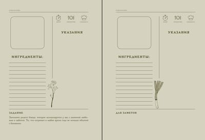 Внутри вы найдете тематические задания и вопросы для сближения, рецепты и советы по приготовлению, а также удобные поля для записи ваших собственных кулинарных шедевров.