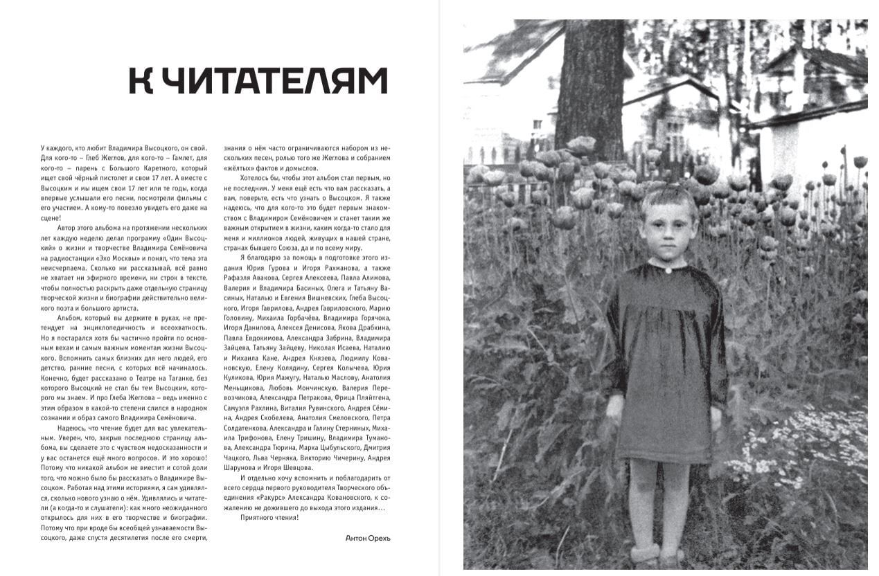 Альбом, который вы держите в руках, не претендует на энциклопедичность и всеохватность. Но автор постарался хотя бы частично пройти по основным вехам и самым важным моментам жизни Высоцкого. Вспомнить самых близких для него людей, его детство, ранние песни, с которых всё начиналось. Конечно, будет рассказано о Театре на Таганке, без которого Высоцкий не стал бы тем Высоцким, которого мы знаем. И про Глеба Жеглова – ведь именно с этим образом в какой-то степени слился в народном сознании и образ самого Владимира Семёновича.