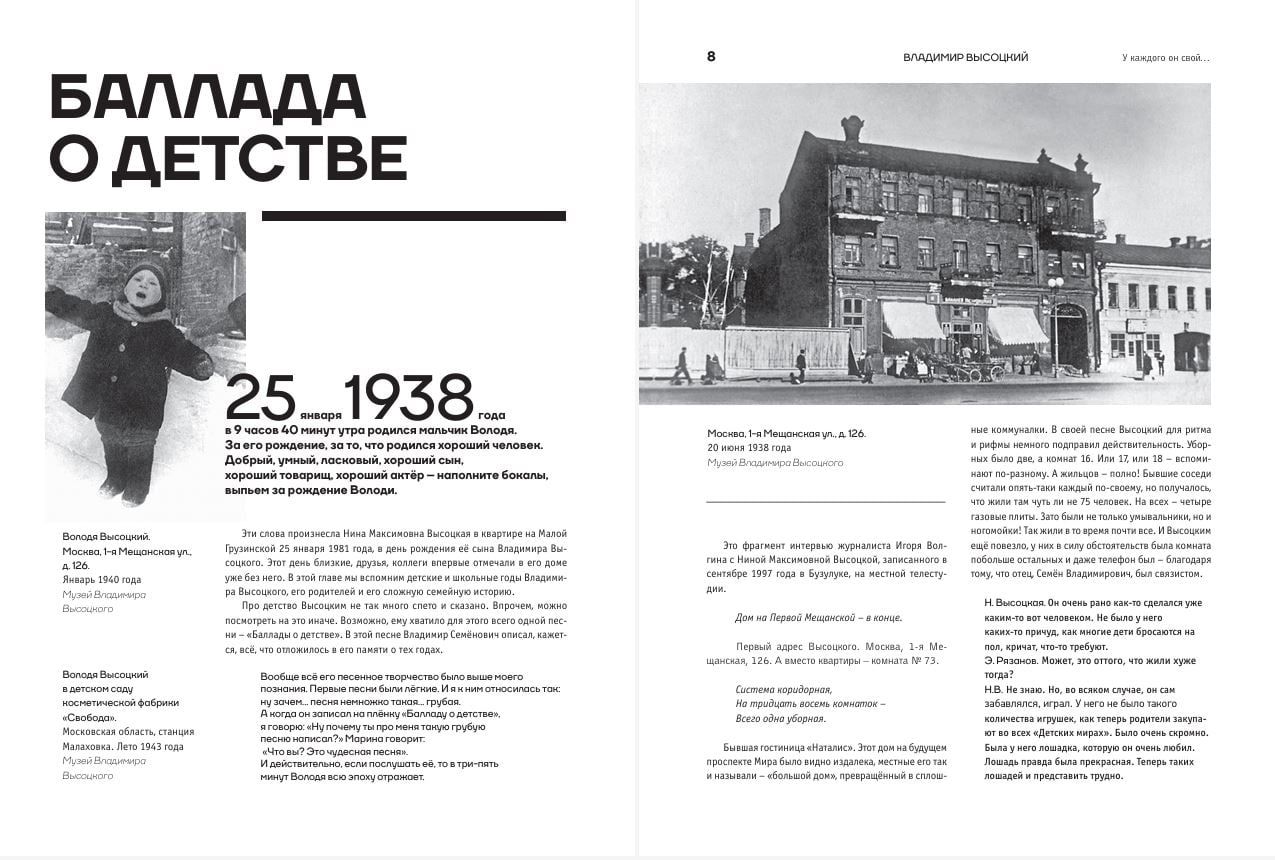 Альбом проиллюстрирован редкими фотографиями из архивов семьи Высоцкого, Государственного Музея Владимира Высоцкого, коллекционеров и поклонников творчества поэта. Работая над этими историями, автор сам удивлялся, сколько нового он узнал о Владимире Высоцком: как много неожиданного открылось в его творчестве и биографии.