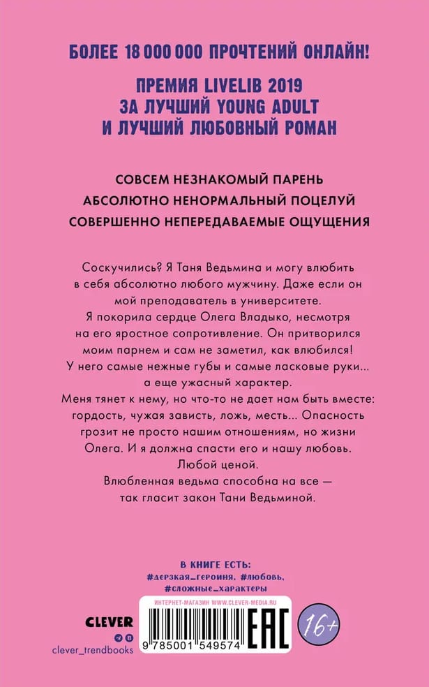 Соскучились? Я — Таня Ведьмина и могу влюбить в себя абсолютно любого мужчину. Даже если он — мой преподаватель в университете. Я покорила сердце Олега Владыко несмотря на его яростное сопротивление. Он притворился моим парнем и сам не заметил как влюбился! У него самые нежные губы и самые ласковые руки...а еще ужасный характер. Меня тянет к нему, но что-то не дает нам быть вместе: гордость, чужая зависть, ложь, месть...Опасность грозит не просто нашим отношениям, но жизни Олега. И я должна спасти его и нашу любовь. Любой ценой. Влюбленная ведьма способна на все — так гласит закон Тани Ведьминой.