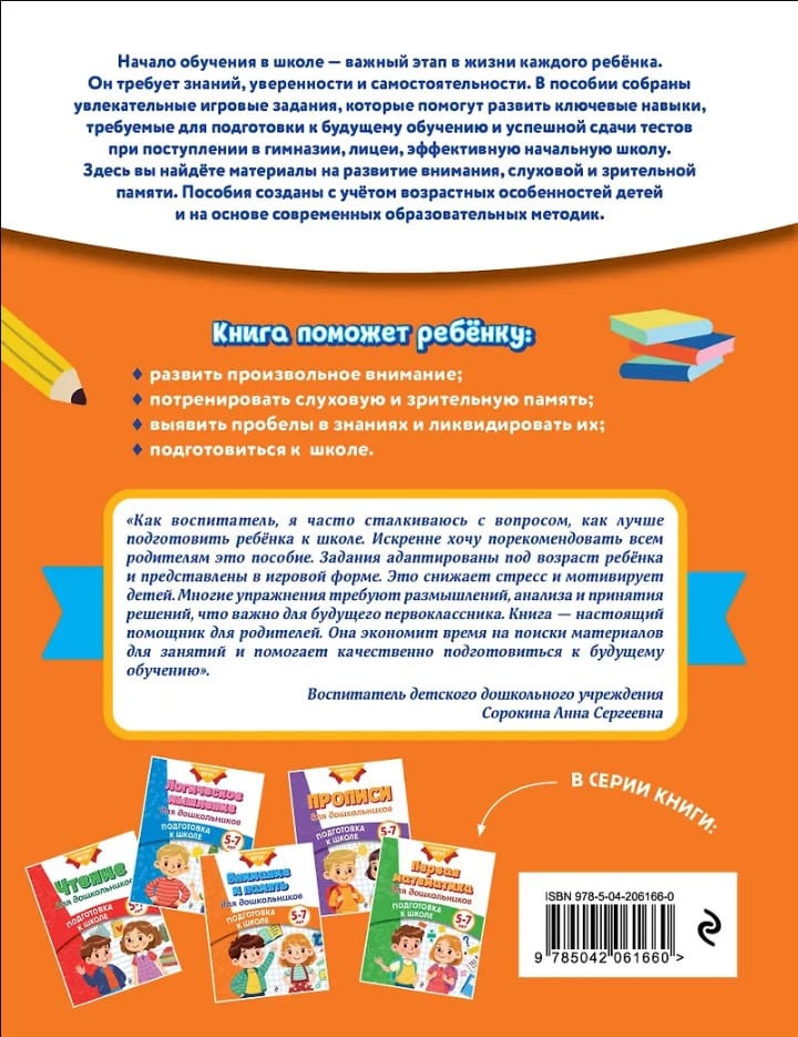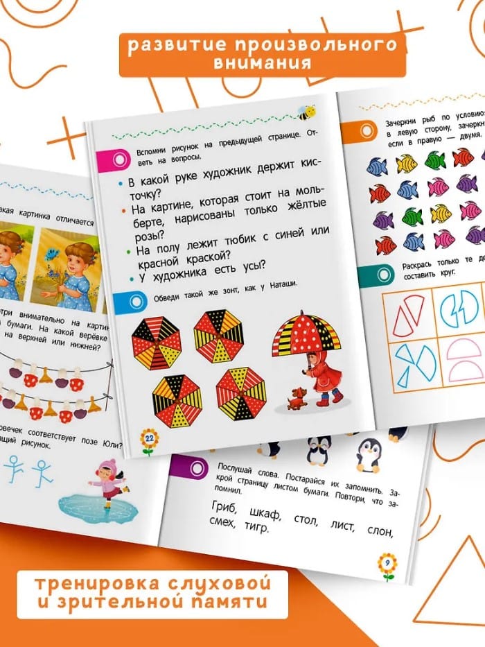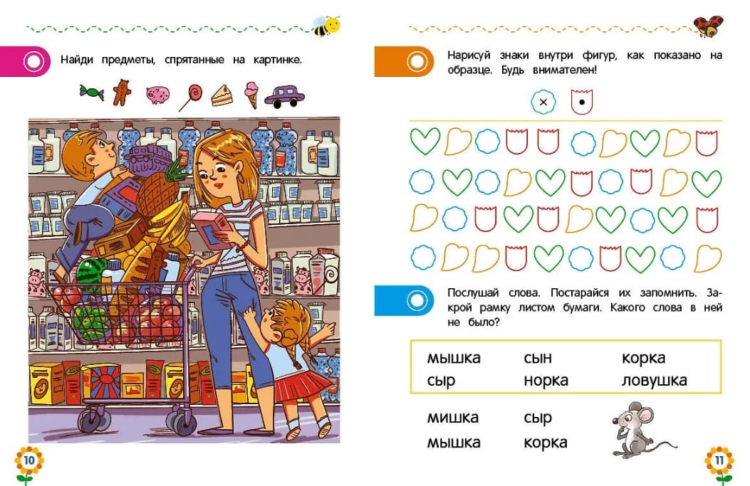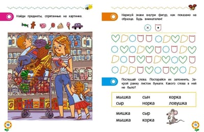 Поступление в 1 класс — важнейший этап в жизни ребёнка, и к нему нужно хорошо подготовиться. Тренажёр включает в себя задания разного типа на проверку степени усвоения базовых навыков и умений, необходимых для дальнейшего обучения. С помощью пособия можно проверить у дошкольника уровень развития произвольного внимания, слуховой и зрительной памяти, способности к переключению и удержанию внимания и понять: умеет ли он находить одинаковые рисунки, предметы такие же, как в рамке; дорисовывать по образцу; искать то, что спрятано на картинке; сопоставлять предмет с его тенью; обводить по условию. Задания, представленные в тренажере, помогут оценить способности ребёнка, определить, с чем он справляется успешно, и выделить те области, которые вызывают у него затруднения. Книга-развивашка от издательства «Эксмо» будет полезна девочкам и мальчикам 5, 6, 7 лет для подготовки к школе.