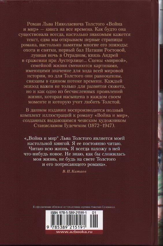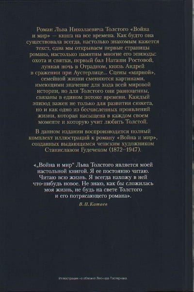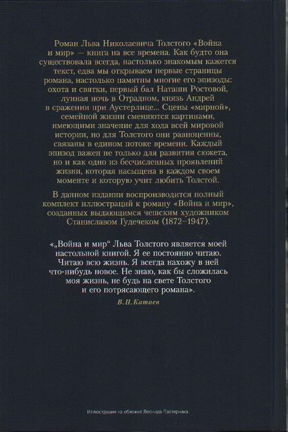 Роман Льва Николаевича Толстого «Война и мир» — книга на все времена. Кажется, что она существовала всегда, настолько знакомым кажется текст, едва мы открываем первые страницы романа, настолько памятны многие его эпизоды: охота и святки, первый бал Наташи Ростовой, лунная ночь в Отрадном, князь Андрей в сражении при Аустерлице... Сцены «мирной», семейной жизни сменяются картинами, имеющими значение для хода всей мировой истории, но для Толстого они равноценны, связаны в едином потоке времени. Каждый эпизод важен не только для развития сюжета, но и как одно из бесчисленных проявлений жизни, которая насыщена в каждом своем моменте и которую учит любить Толстой. В данном издании воспроизводится полный комплект иллюстраций к роману «Война и мир», созданных выдающимся чешским художником Станиславом Гудечеком (1872–1947).