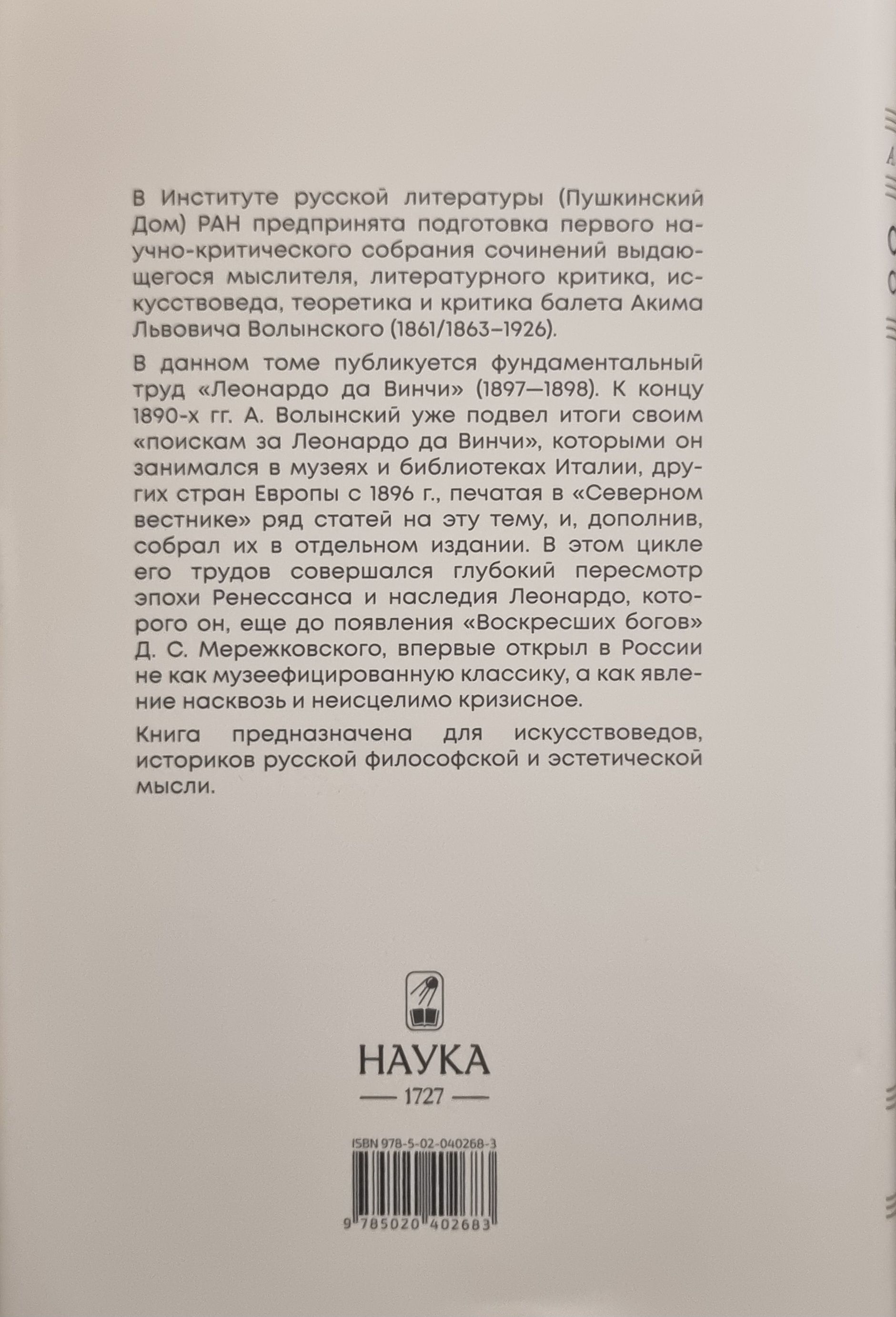 В данном томе собрания сочинений русского мыслителя, литературного и балетного критика, искусствоведа Акима Львовича Волынского (1861/1863—1926) публикуется его фундаментальный труд «Леонардо да Винчи» (1897–1898). К концу 1890-х гг. Волынский уже подвел итоги своим «поискам за Леонардо да Винчи», которыми он занимался в музеях и библиотеках Италии, других стран Европы с 1896 г., печатая в «Северном вестнике» ряд статей на эту тему, и, дополнив, собрал их в отдельном издании. В этом цикле его трудов совершался глубокий пересмотр эпохи Ренессанса и наследия Леонардо, которого он, еще до появления «Воскресших богов» Д. С. Мережковского, впервые открыл в России не как музеефицированную классику, а как явление насквозь и неисцелимо кризисное.