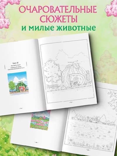 «Волшебная деревня Ттэнрана. Учимся акварельной технике иллюстратора. Раскраска» — это волшебная книга для тех, кто ищет способ расслабиться и погрузиться в мир творчества. В этой раскраске вас ждут не только очаровательные сказочные деревни, такие как деревня с морковками, коттедж кроликов и летний отдых котиков, но и милые пейзажи — желтые поля рапса, лаванда в магазине и тихие уголки, где время будто замедляется.