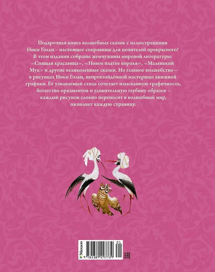 Подарочная книга волшебных сказок с иллюстрациями Ники Гольц — настоящее сокровище для ценителей прекрасного! В этом издании собраны жемчужины мировой литературы: «Спящая красавица», «Новое платье короля», «Маленький Мук» и другие великолепные сказки. Но главное волшебство — в рисунках Ники Гольц, непревзойдённой мастерицы книжной графики. Её узнаваемый стиль сочетает изысканную графичность, богатство орнаментов и удивительную глубину образов — каждый рисунок словно переносит в волшебный мир, оживляет каждую страницу.