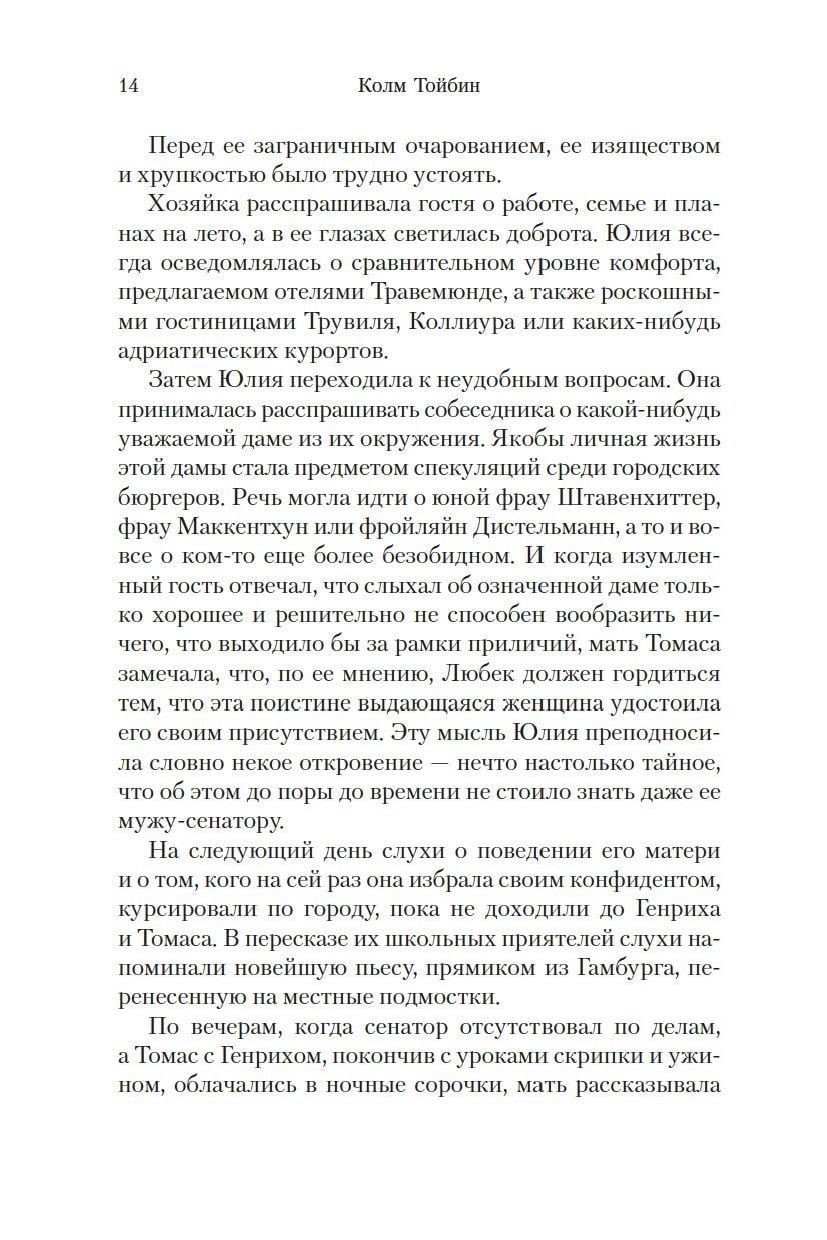 Это семейная сага, охватывающая больше полувека; сюда уместились и детство в патриархальном Любеке, и юность в богемном Мюнхене, и семейное счастье, и непроницаемые тайны внутреннего мира, и Первая мировая война, и бегство от фашистской диктатуры, и Вторая мировая война, и начало войны холодной...