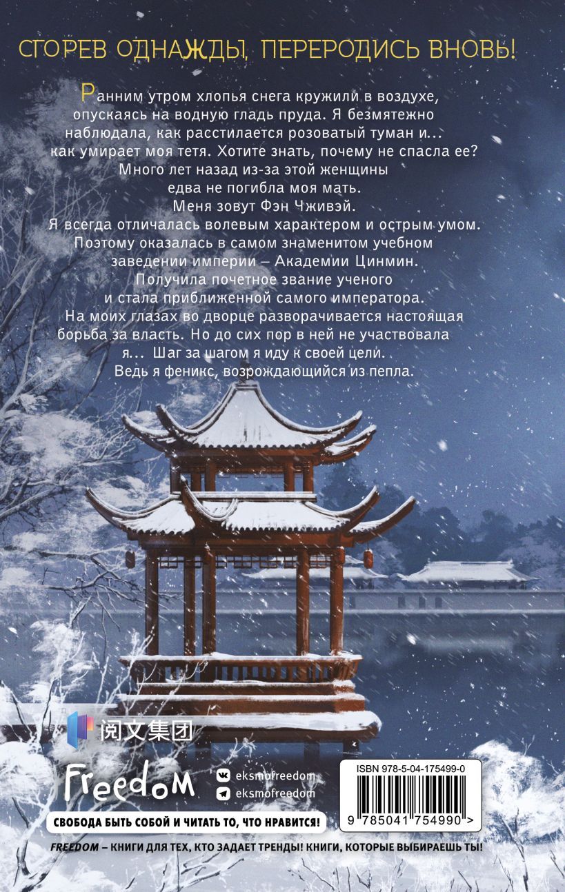Ранним утром хлопья снега кружили в воздухе, опускаясь на водную гладь пруда. Я безмятежно наблюдала, как расстилается розоватый туман и… как умирает моя тетя. Хотите знать, почему не спасла ее? Много лет назад из-за этой женщины едва не погибла моя мать. Меня зовут Фэн Чживэй. Я всегда отличалась волевым характером и острым умом. Поэтому оказалась в самом знаменитом учебном заведении империи — Академии Цинмин. Получила почетное звание ученого и стала приближенной самого императора. На моих глазах во дворце разворачивается настоящая борьба за власть. Но до сих пор в ней не участвовала я… Шаг за шагом я иду к своей цели. Ведь я феникс, возрождающийся из пепла.