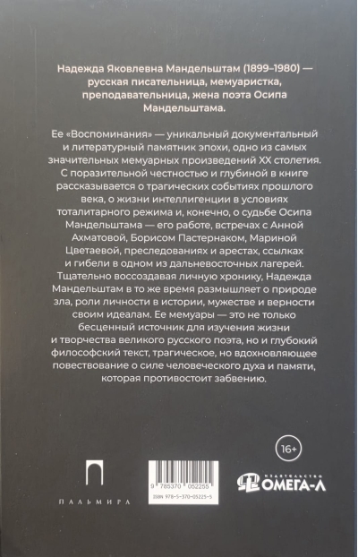 «Воспоминания» Надежды Мандельштам представляют широкую панораму литературной и общественной жизни советской эпохи, в особенности сталинского времени. Главным героем этой панорамы стал Осип Мандельштам. Повествование вдовы поэта — о его работе, дружбе с Ахматовой, обысках, двух ссылках и гибели в одном из дальневосточных лагерей.