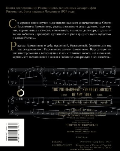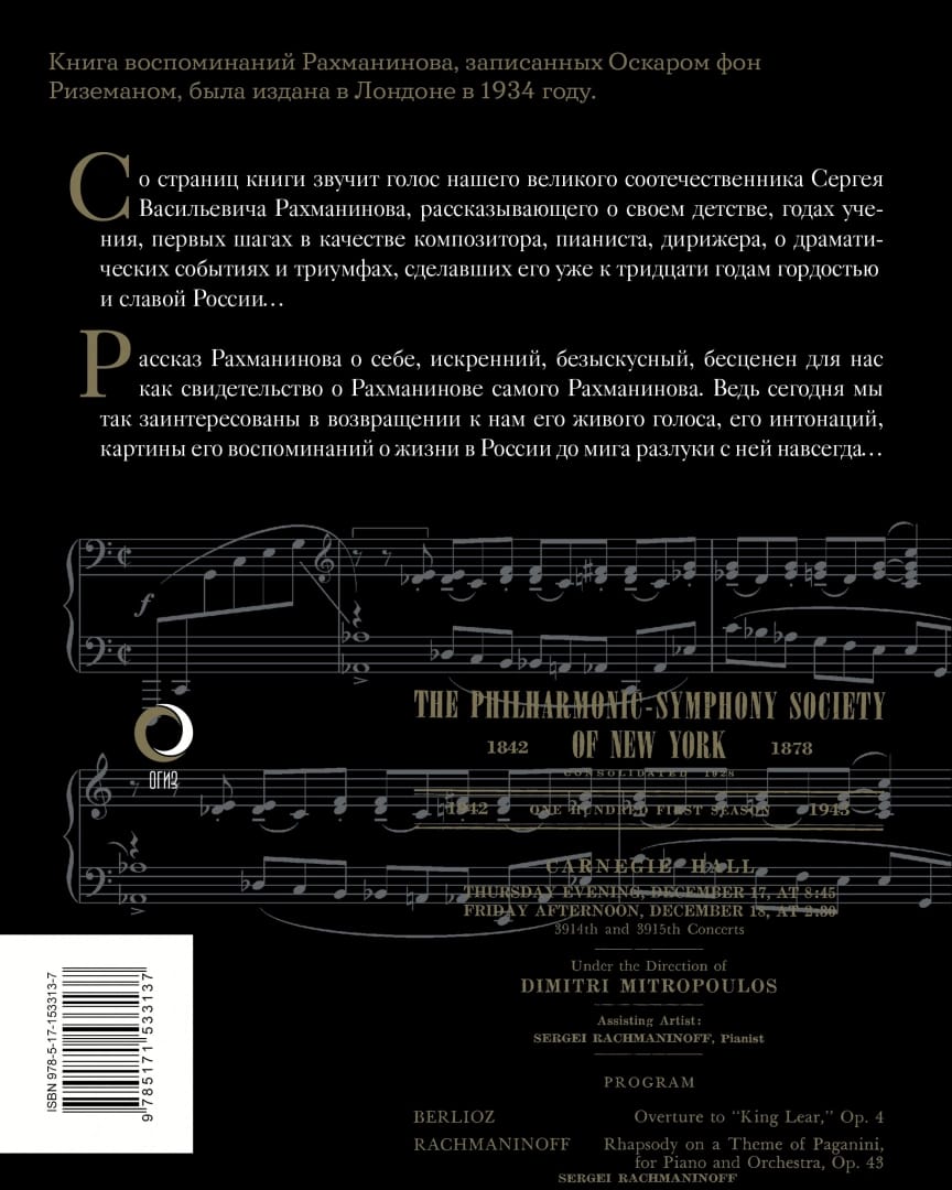 Сергей Васильевич Рахманинов, к сожалению, не оставил мемуаров, и перед нами фактически единственный подлинный мемуарный документ — рассказ композитора о себе. Книга воспоминаний Рахманинова, записанных Оскаром фон Риземаном, была издана в Лондоне в 1934 году. Со страниц книги звучит голос нашего великого соотечественника, рассказывающего о своем детстве, годах учения, первых шагах в качестве пианиста, дирижера, о драматических событиях и триумфах, сделавших его уже к тридцати годам гордостью и славой России.