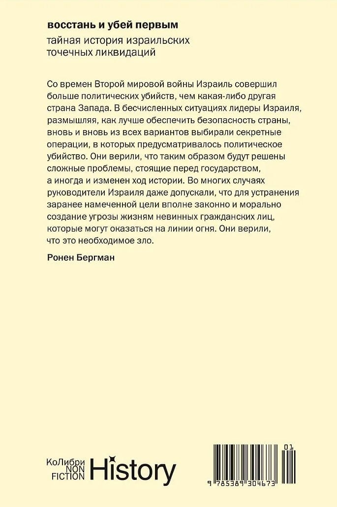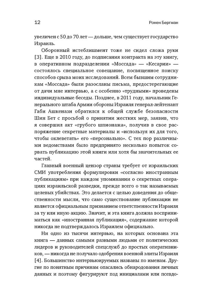Создание государства Израиль в 1948 году привело к созданию его разведки — самой смертоносной в мире. В ее арсенале всегда было особое оружие: политические убийства. «Целевые» убийства применялись бесчисленное количество раз, как против больших, так и малых врагов, в том числе превентивно. Эта книга основана на ранее тщательно засекреченных архивных материалах и интервью, ни одно из которых не получило одобрения военной элитой Израиля. Известный военный аналитик Ронен Бергман предлагает захватывающий рассказ о программах целевых убийств: об их успехах и неудачах, а также моральной и политической цене, которую пришлось заплатить тем, кто одобрил и выполнил эти миссии.