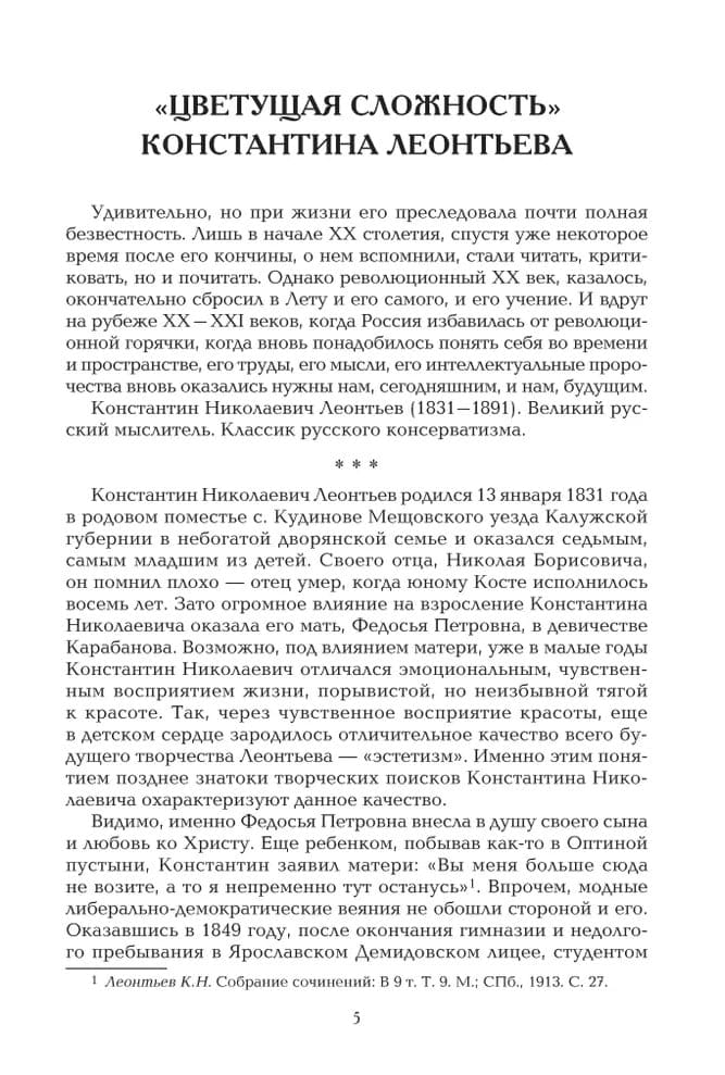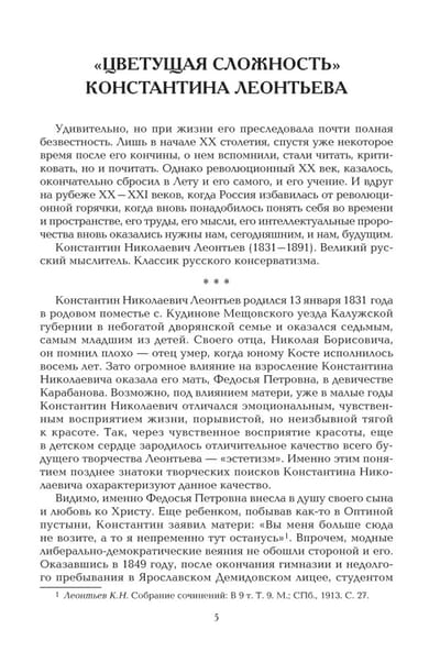 Константин Николаевич Леонтьев (1831-1891) - крупный русский консервативный публицист-государственник, выступавший за более тесные культурные связи между Россией и Востоком и против того, что он считал катастрофическим эгалитаризмом, утилитарным влияний Запада. Леонтьев видел, что западная цивилизация находится в глубоком кризисе и русскому обществу незачем перенимать ее либерально-демократические институты. Он считал, что государственная и общественная жизнь в Российской империи должна базироваться на «византизме» - твердой единодержавной власти, строгой церковности и жестком сословно-иерархическом делении общества. Публикуемый сборник избранных работ, собранный Леонтьевым и впервые изданный в Москве в 1885-1886 годах, по-своему актуален и в наши дни. Настоящее издание заключает статья «Разочарованный славянофил» видного религиозного философа Сергея Николаевича Трубецкого (1861-1905), осмысляющая динамику и некоторые парадоксальные противоречия К.Н. Леонтьева.