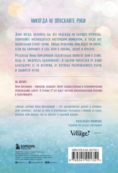 Никогда не опускайте руки. Даже когда, казалось бы, все надежды на будущее утрачены, попробуйте наслаждаться настоящим моментом, и тогда все обязательно станет лучше. Любые проблемы вам будут по плечу, если вы сохраните в себе веру в любовь, добро и красоту. Рассказы Анны Кирьяновой обязательно помогут вам в этом, ведь ее мудрость вдохновляет. А тысячи читателей от души благодарят ее за истории, от которых расправляются плечи и дышится легко.