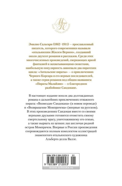 Эмилио Сальгари (1862–1911) — прославленный писатель, которого современники называли «итальянским Жюлем Верном», создавший около двухсот романов и рассказов. Среди этих многочисленных произведений, сверкающих яркой фантазией и захватывающими сюжетами, наибольшую популярность завоевали два пиратских цикла: «Антильские пираты», о приключениях Черного Корсара и его верных последователей, а также серия романов под общим названием «Пираты Малайзии», о благородном разбойнике Сандокане. В настоящее издание вошли два долгожданных романа о дальнейших приключениях отважного пирата: «Возмездие Сандокана» (в новом переводе) и «Возвращение Момпрачема» (впервые на русском). В этих произведениях Сандокан вместе со своими верными друзьями готовится отомстить своему смертельному врагу, уничтожившему его семью, а также вырвать из цепких лап англичан родной остров Момпрачем. Впервые в России произведения сопровождаются полным комплектом иллюстраций знаменитого итальянского художника Альберто делла Валле.