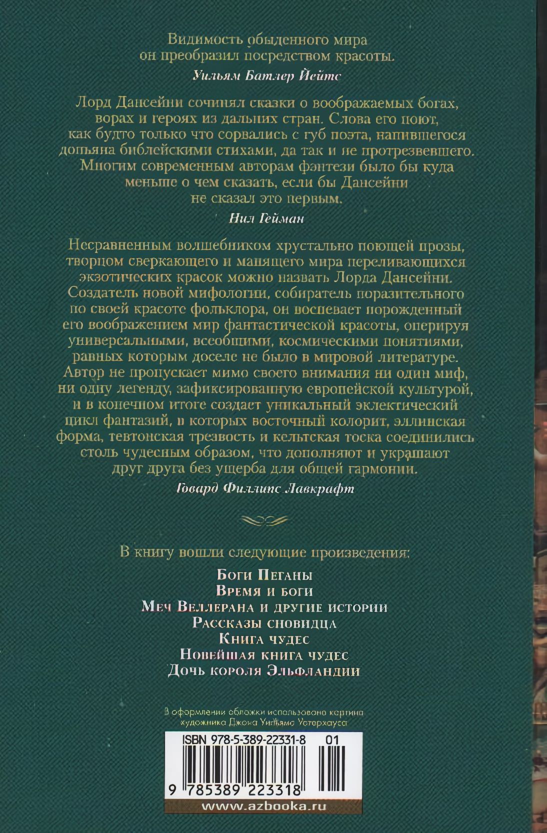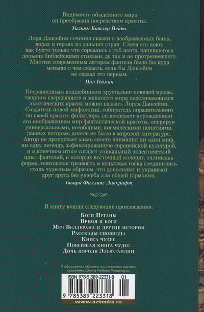 Эдвард Джон Мортон Дракс Планкетт, 18-й барон Дансейни, публиковавшийся как лорд Дансейни, — знаменитый автор множества романов, пьес и литературных сказок, стоявший у истоков самого жанра фэнтези. Едва ли не первым в европейской литературе он создал целый «вторичный мир» — со своей космологией, мифологией, историей и географией. Его мифология повлияла на Лавкрафта, Толкина и Борхеса, а парадоксальный юмор, постоянная игра с читательскими ожиданиями — на Нила Геймана и на всю современную ироническую фэнтези. В данной книге вашему вниманию предлагаются шесть сборников мастера — «Боги Пеганы», «Время и боги», «Меч Веллерана и другие истории», «Рассказы сновидца», «Книга чудес», «Новейшая книга чудес», — а также роман «Дочь короля Эльфландии». Здесь бог радости и сладкоголосых музыкантов может встретить бога сновидений и фантазий, здесь народу полей никогда не добраться до Каркассона, здесь 250-летний кентавр наконец отправляется на поиски невесты, а парламент деревни, расположенной недалеко от границы Волшебной страны, решает, чтобы их землею правил чародей... Часть произведений публикуется в новых переводах, остальные — в новой редакции. Издание сопровождается иллюстрациями знаменитого художника-сказочника Сидни Сайма, сделанными для первых публикаций книг Дансейни.