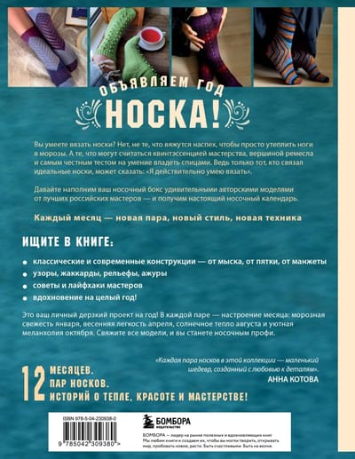 Перед вами — книга, для которой лучшие российские мастера создали 12 уникальных моделей — на каждый месяц года. Разные сезоны, разные настроения, стили, конструкции и техники: от классики до эксперимента, от минимализма до вау-эффекта. Жаккард? Есть. Ажур? Конечно. Необычные пятки и мысок? Обязательно. Эта книга — ваш личный вязальный проект на год.