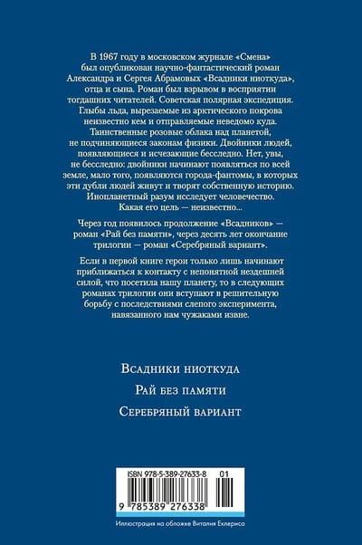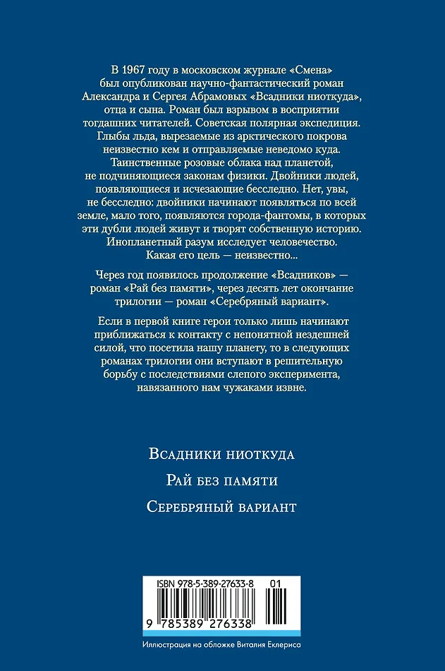 В 1967 году в московском журнале «Смена» был опубликован научно-фантастический роман Александра и Сергея Абрамовых «Всадники ниоткуда», отца и сына. Роман был взрывом в восприятии тогдашних читателей. Советская полярная экспедиция. Глыбы льда, вырезаемые из арктического покрова неизвестно кем и отправляемые неведомо куда. Таинственные розовые облака над планетой, не подчиняющиеся законам физики. Двойники людей, появляющиеся и исчезающие бесследно. Нет, увы, не бесследно: двойники начинают появляться по всей земле, мало того, появляются города-фантомы, в которых эти дубли людей живут и творят собственную историю. Инопланетный разум исследует человечество. Какая его цель — неизвестно…