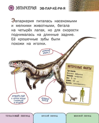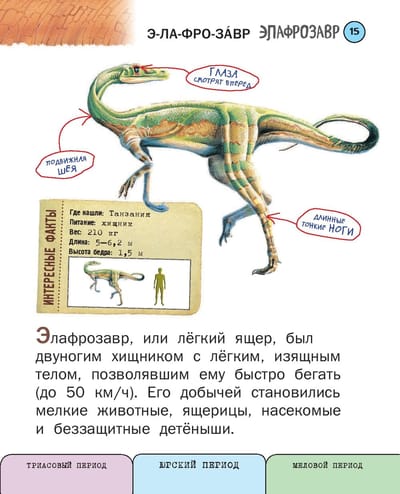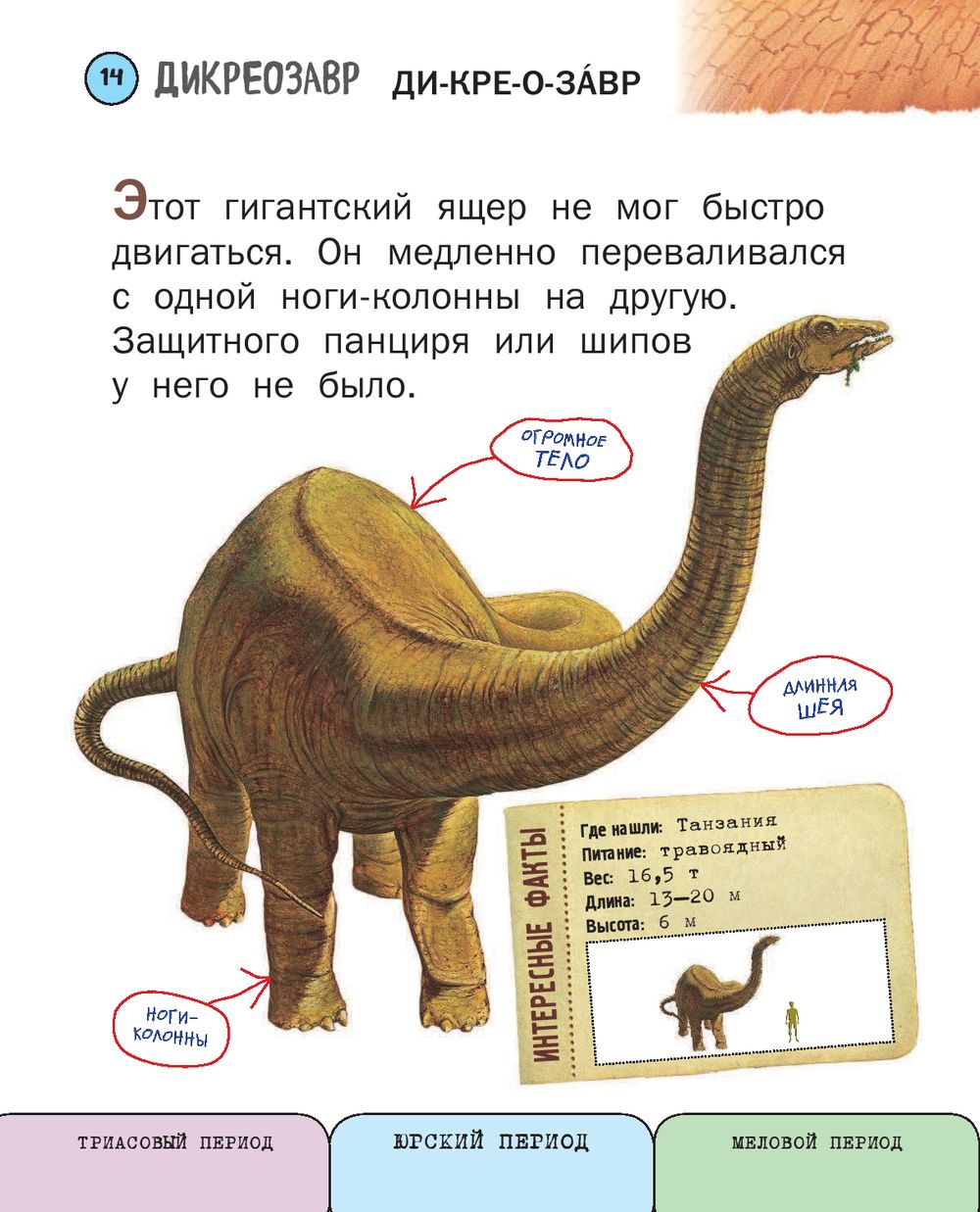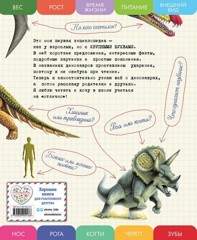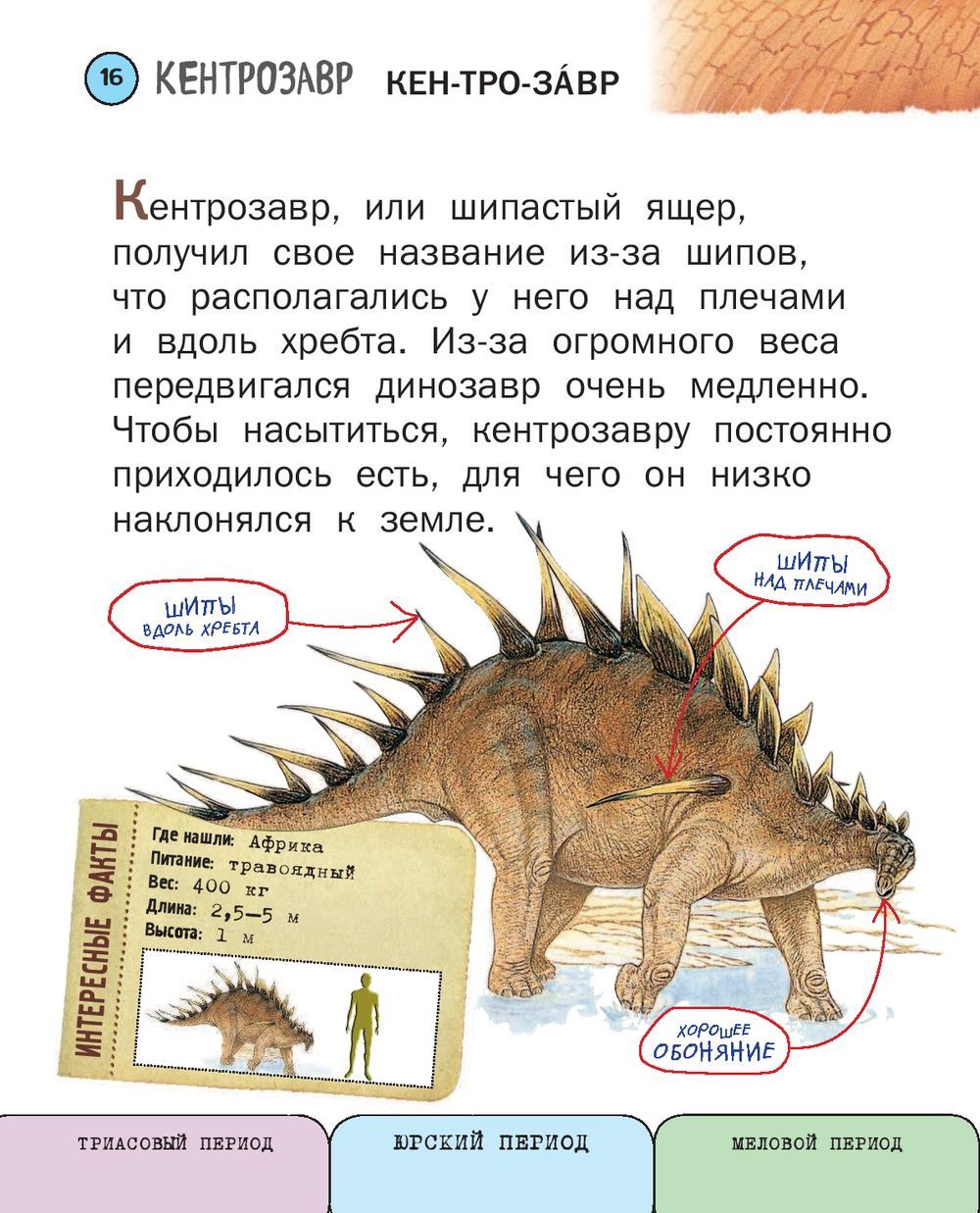 Это настоящая энциклопедия для детей: все только самое важное, легко запоминающееся — и с крупными буквами. В книге с большими и подробными рисунками собраны интересные сведения о 223 хищных и травоядных динозаврах.