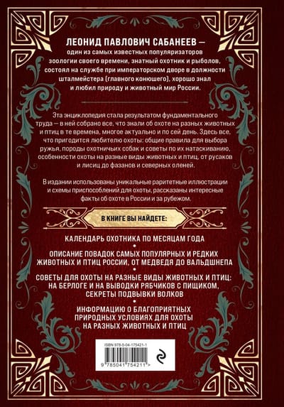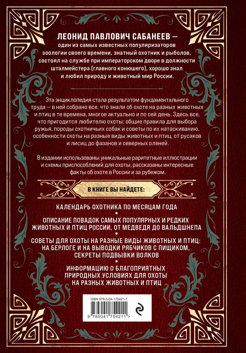 Эта энциклопедия стала результатом фундаментального труда — в ней собрано все, что знали об охоте на разных животных и птиц в те времена, многое актуально и по сей день. Здесь все, что пригодится любителю охоты: общие правила для выбора ружья, породы охотничьих собак и советы по их натаскиванию, особенности охоты на разные виды животных и птиц, от русаков и лисиц до фазанов и северных оленей. У книги красивый закрашенный обрез. В издании использованы уникальные раритетные иллюстрации и схемы приспособлений для охоты, рассказаны интересные факты об охоте в России и за рубежом.