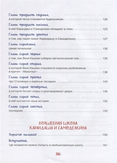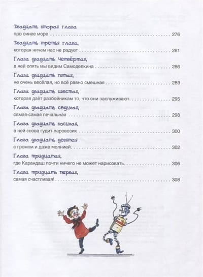 Книга расскажет о приключениях веселых маленьких человечков: художника Карандаша и мастера Самоделкина. Рисунки Карандаша мгновенно оживают, а Самоделкин может смастерить любой, даже самый сложный механизм. В книгу вошли две сказки: «Приключения Карандаша и Самоделкина» и «Волшебная школа Карандаша и Самоделкина».