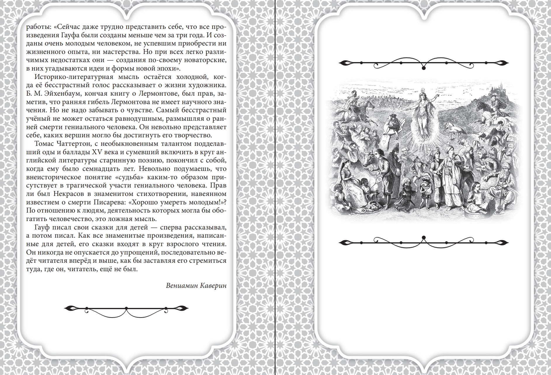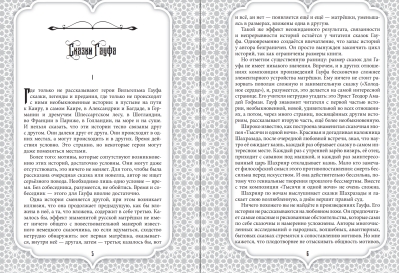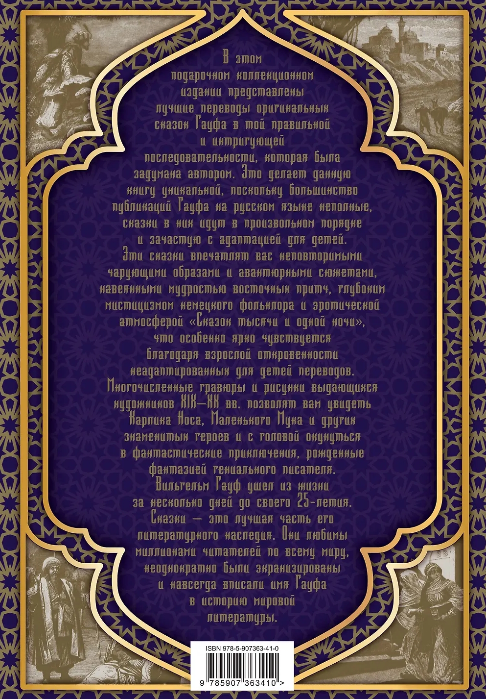 Эти сказки впечатлят вас неповторимыми чарующими образами и авантюрными сюжетами, навеянными мудростью восточных притч, глубоким мистицизмом немецкого фольклора и эротической атмосферой «‎Сказок тысячи и одной ночи»‎, что особенно ярко чувствуется благодаря взрослой откровенности неадаптированных для детей переводов. Многочисленные гравюры и рисунки выдающихся художников XIX-XX вв. позволят вам увидеть Карлика Носа, Маленького Мука и других знаменитых героев и с головой окунуться в фантастические приключения, рожденные фантазией гениального писателя.