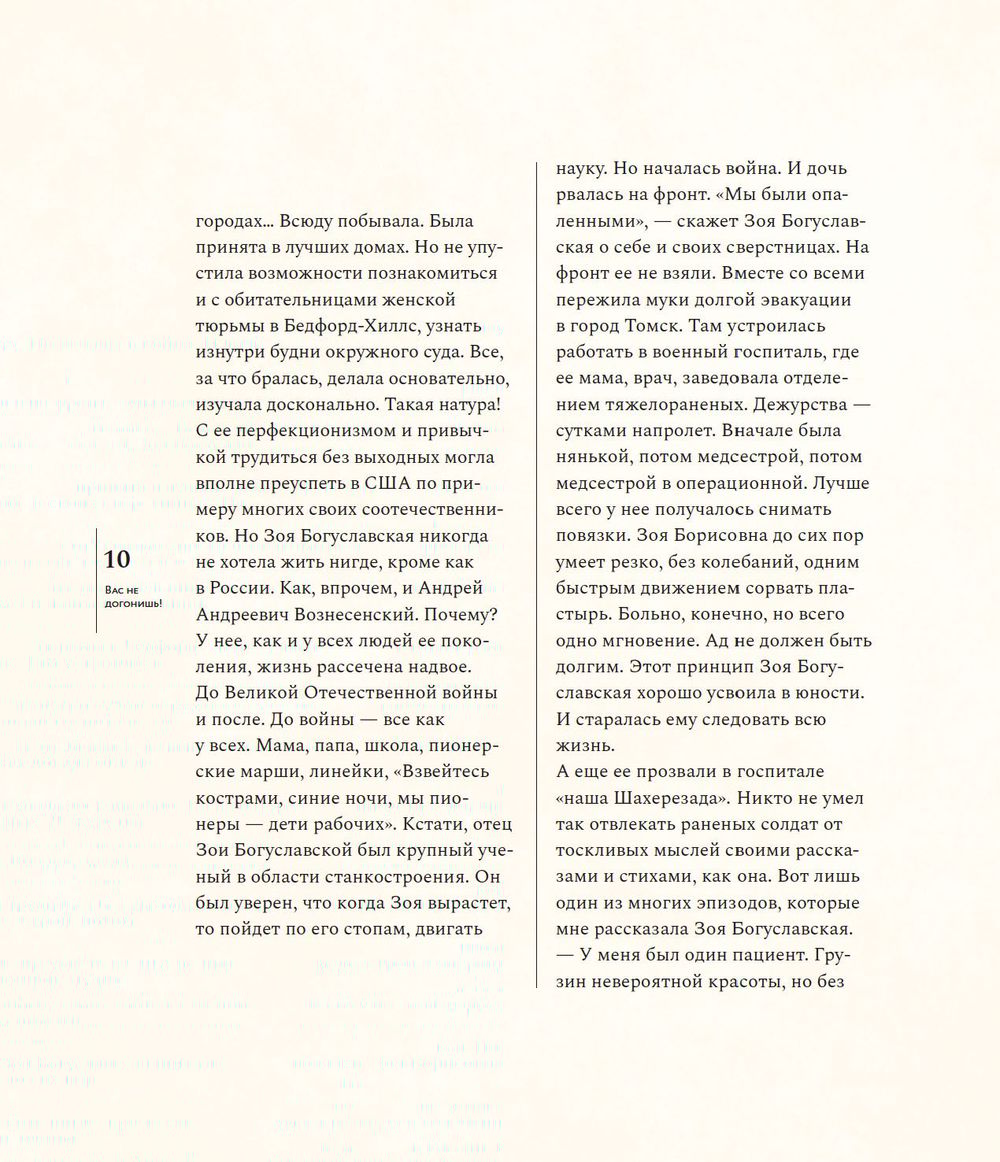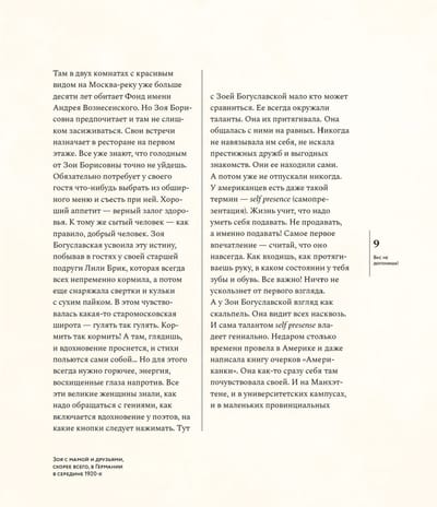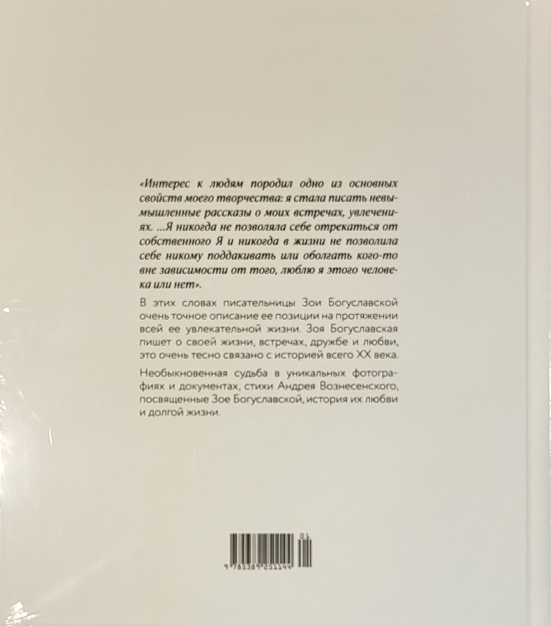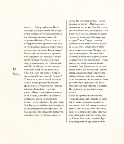 Необыкновенная судьба, невероятные встречи — Зоя Богуславская была музой Андрея Вознесенского, встречалась с Марком Шагалом, дружила с Владимиром Высоцким, Майей Плисецкой, Лилей Брик,Василием Аксеновым и многими-многими, она ничего не боялась, и никогда не отступала — Зоя Богуславская писатель и общественный деятель, организатор фондов, независимых премий и ассоциаций,поддерживающих деятелей культуры. Зое Богуславской исполнилось сто лет. Возраст немалый — целое столетие, несколько эпох за спиной, и каждый период своей жизни, каждый день, она использовала чтобы что-то создавать и кому-то помогать. Книга объединяет фотографии, документы, воспоминания Зои Богуславской, написанные ею и пятьдесят лет назад, и сегодня.