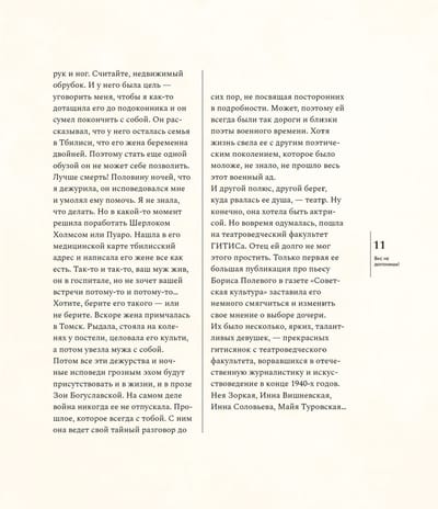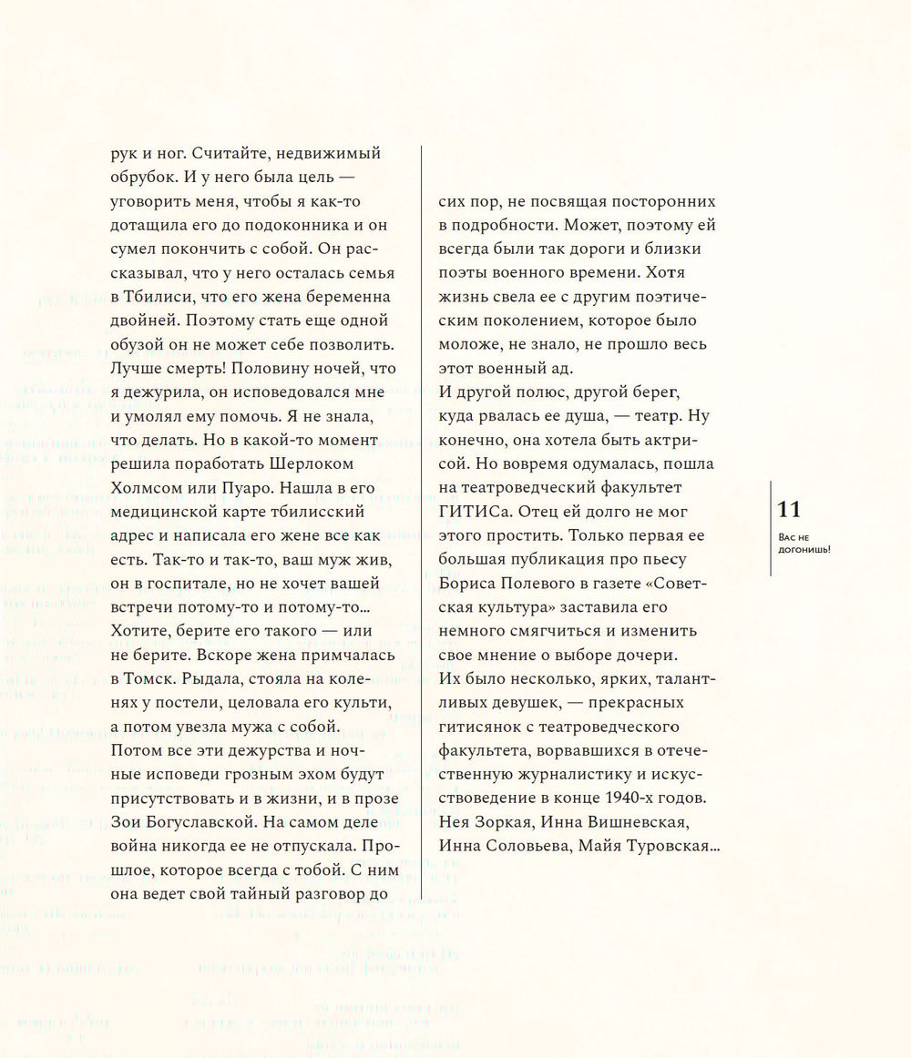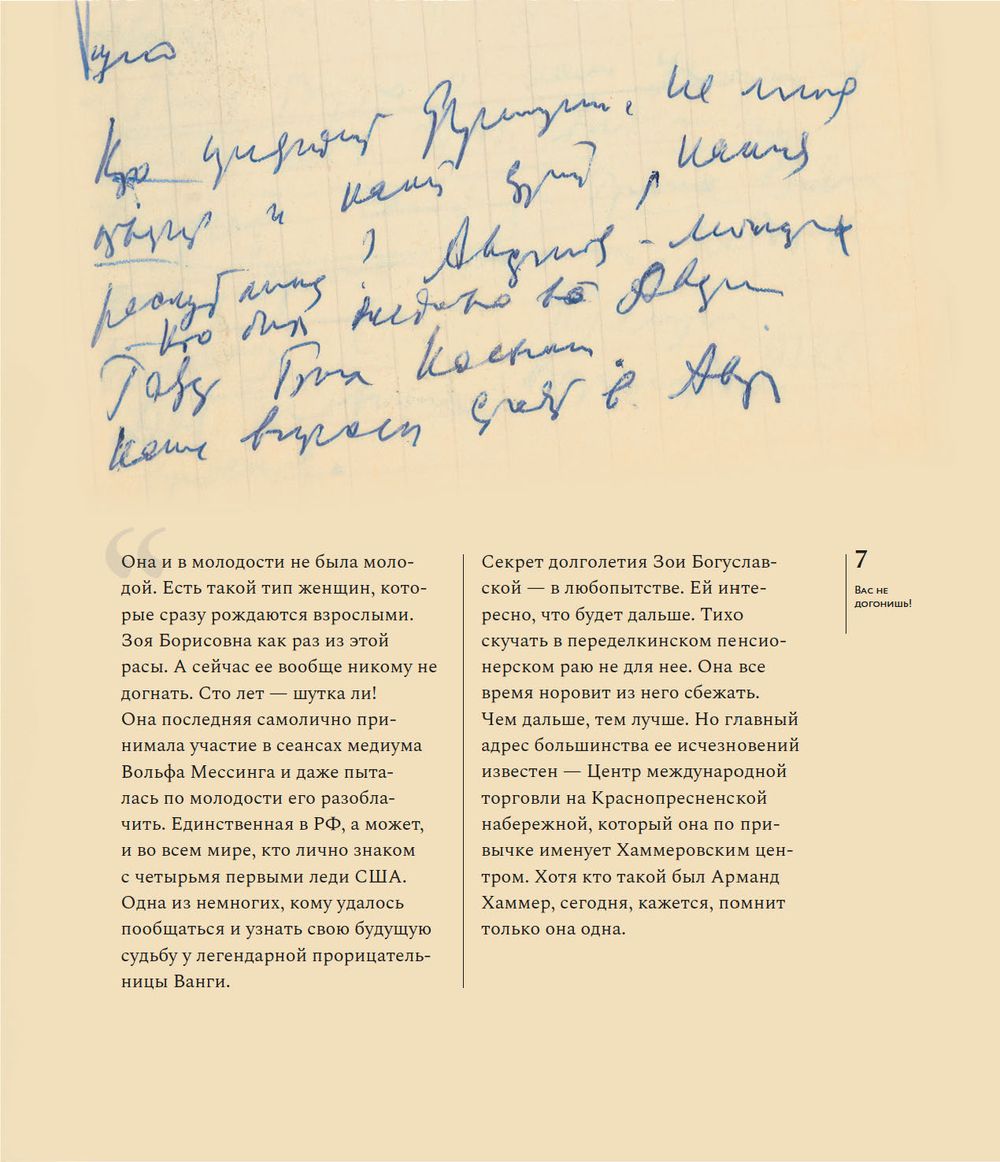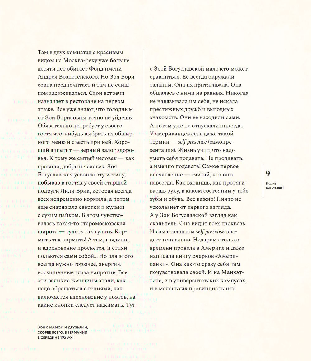 Необыкновенная судьба, невероятные встречи — Зоя Богуславская была музой Андрея Вознесенского, встречалась с Марком Шагалом, дружила с Владимиром Высоцким, Майей Плисецкой, Лилей Брик,Василием Аксеновым и многими-многими, она ничего не боялась, и никогда не отступала — Зоя Богуславская писатель и общественный деятель, организатор фондов, независимых премий и ассоциаций,поддерживающих деятелей культуры. Зое Богуславской исполнилось сто лет. Возраст немалый — целое столетие, несколько эпох за спиной, и каждый период своей жизни, каждый день, она использовала чтобы что-то создавать и кому-то помогать. Книга объединяет фотографии, документы, воспоминания Зои Богуславской, написанные ею и пятьдесят лет назад, и сегодня.