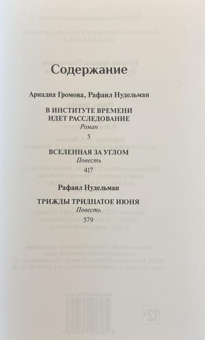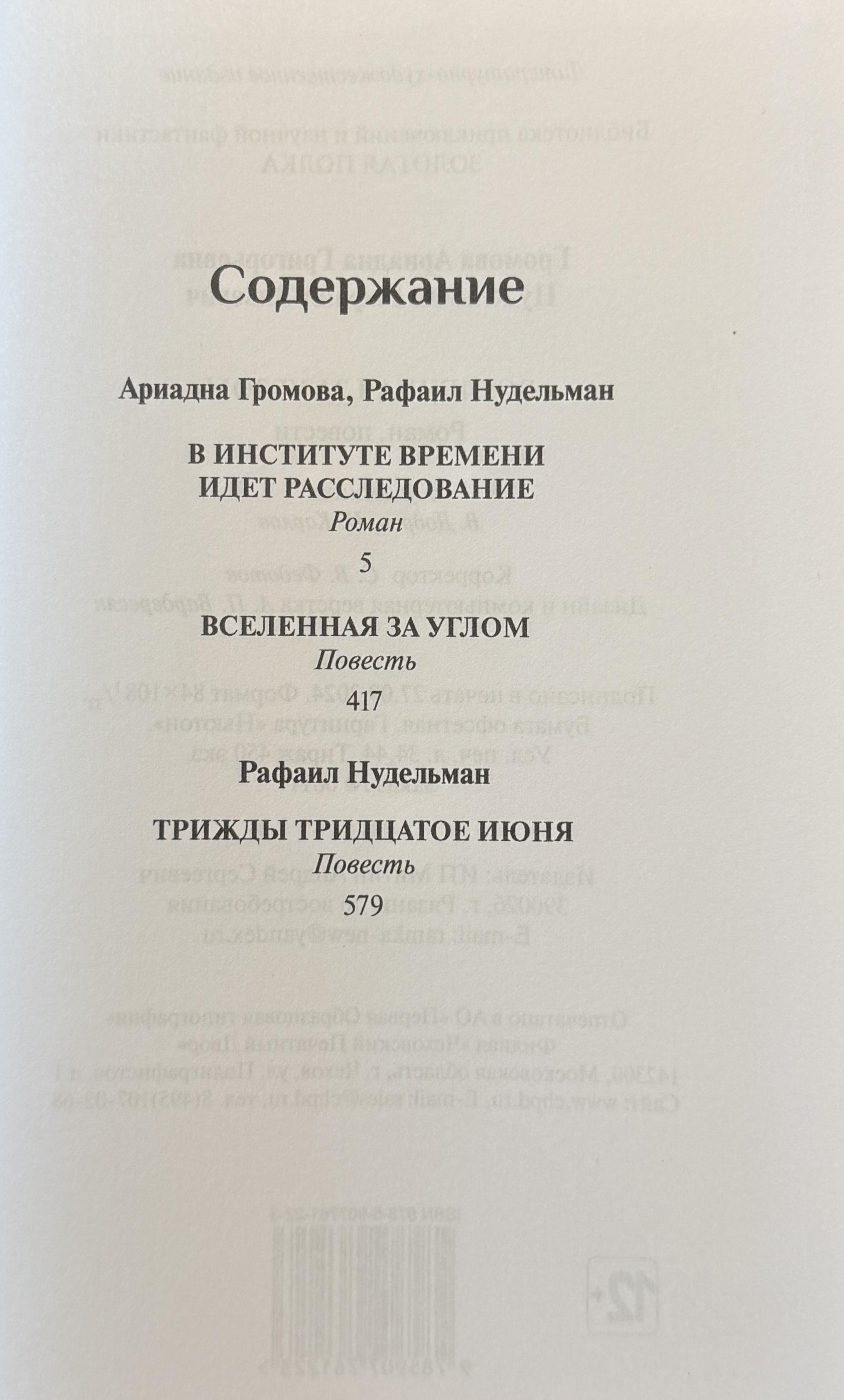 Во второй том собрания сочинений одного из классиков отечественной фантастики Ариадны Громовой вошли произведения, написанные ею совместно с Рафаилом Нудельманом — «Вселенная за углом», «В институте времени идет расследование», а также повесть Р. Нудельмана «Трижды тридцатое июня».