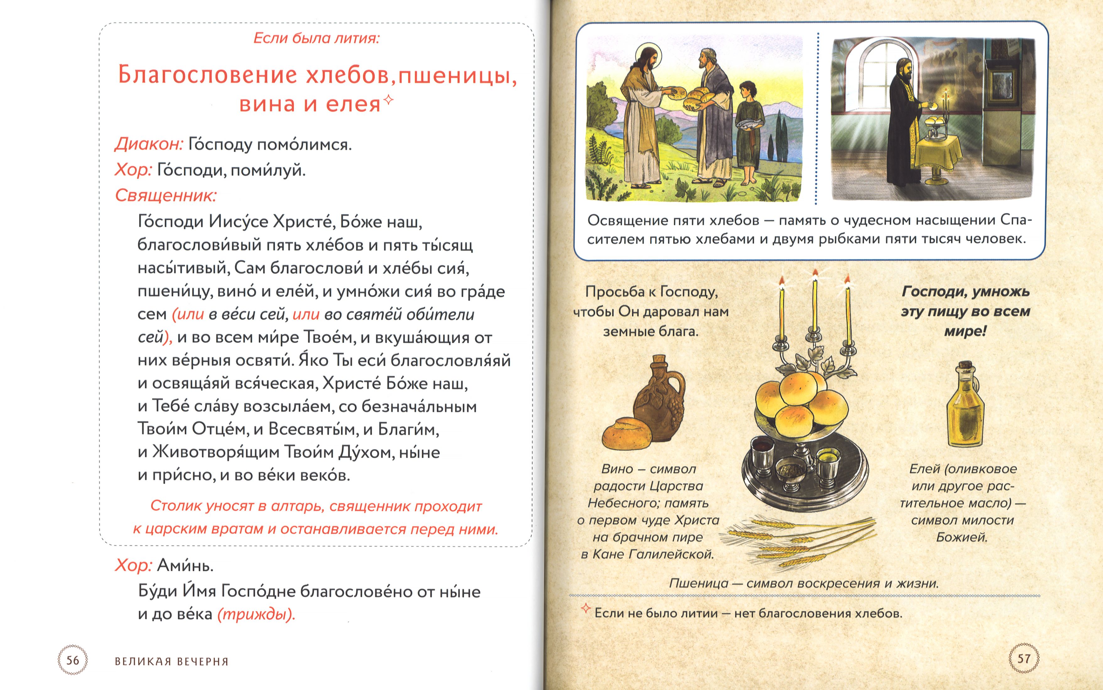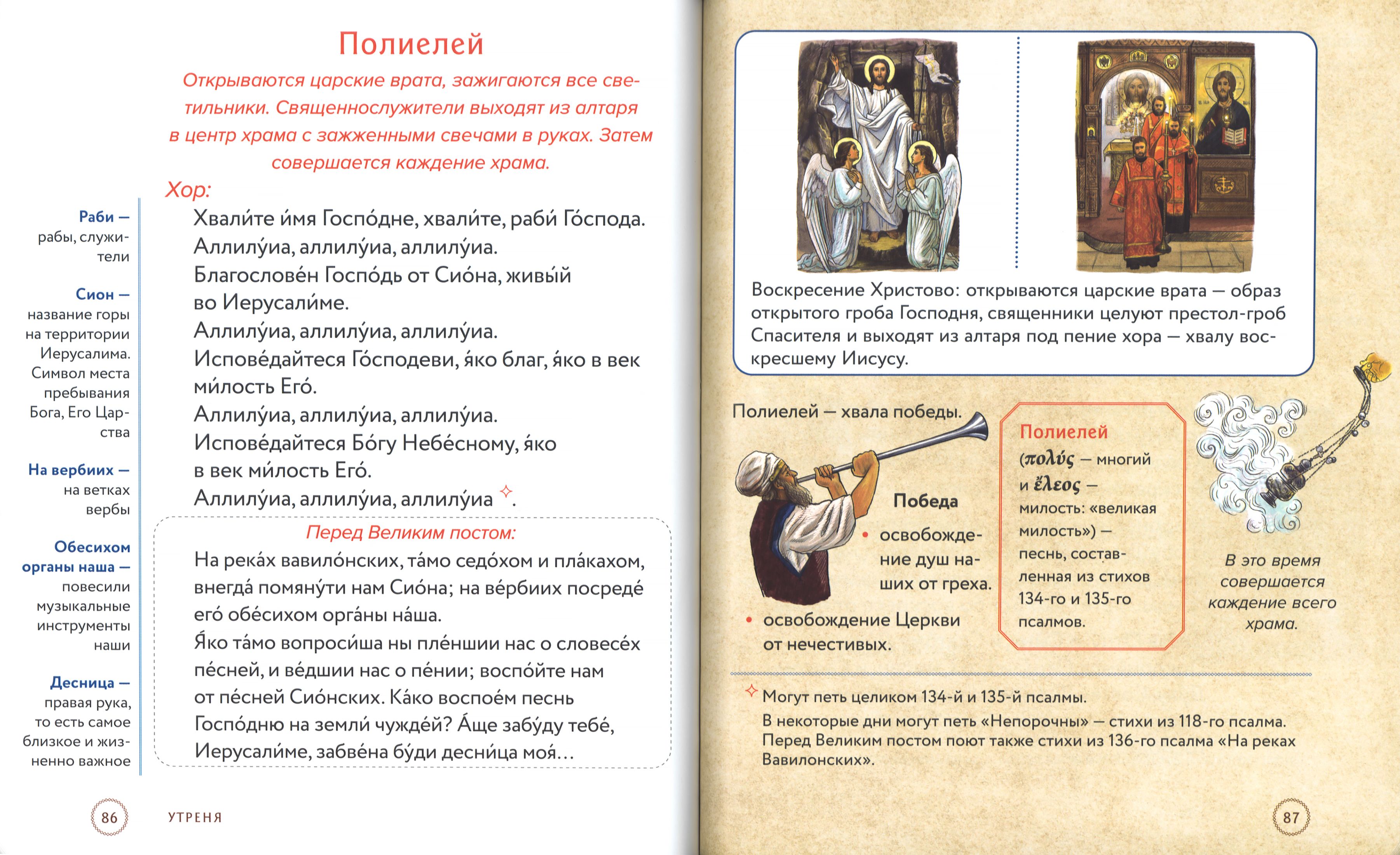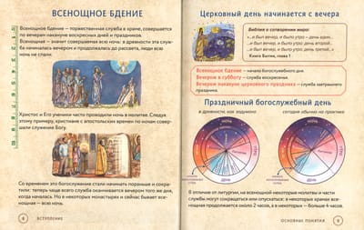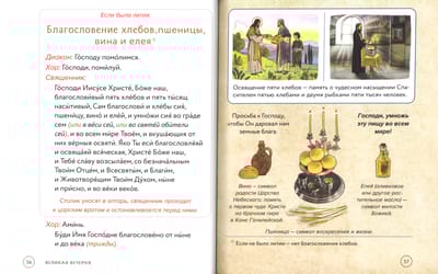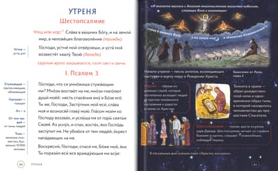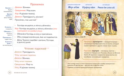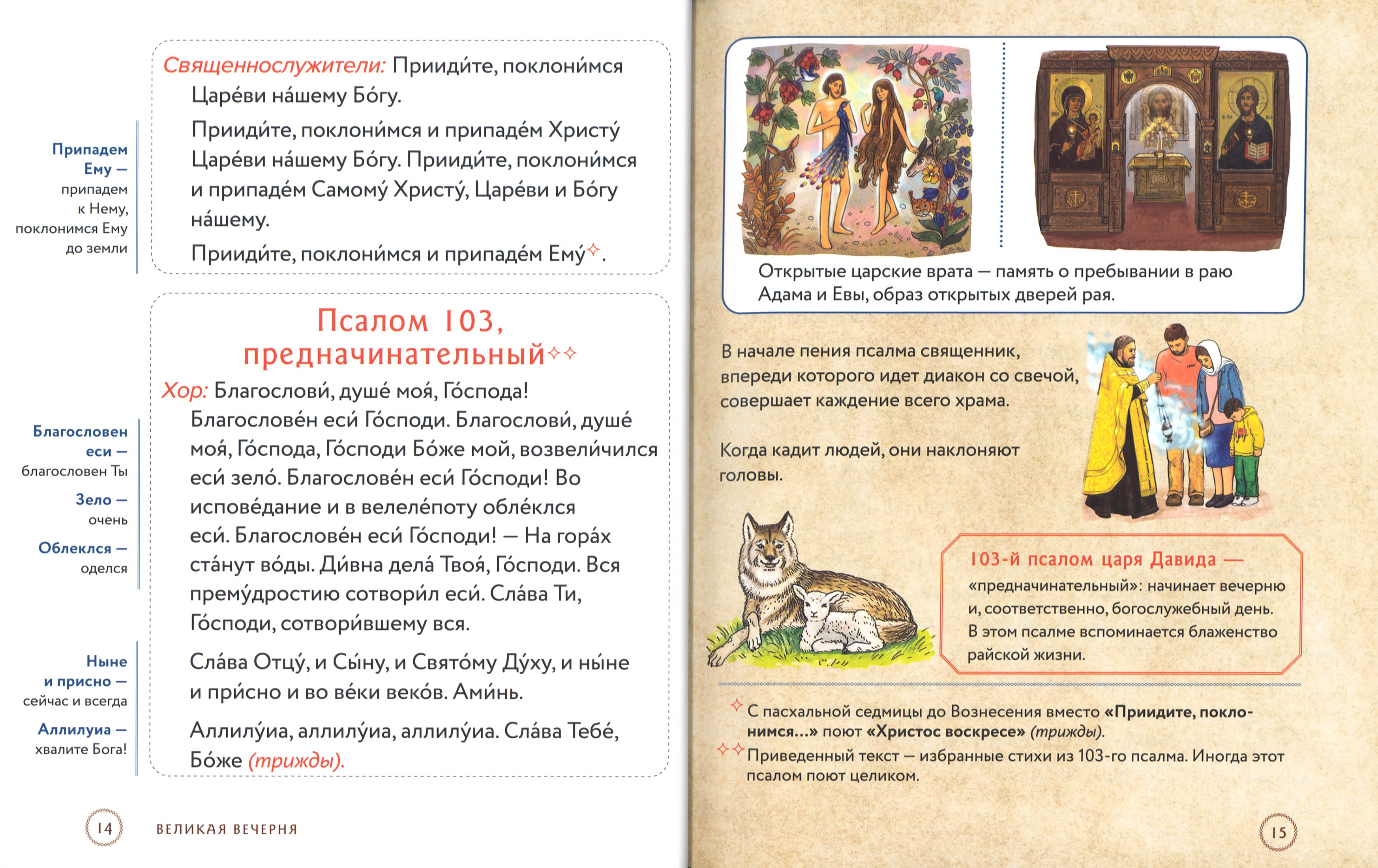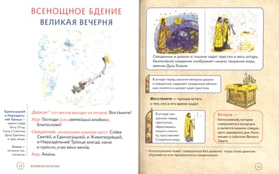 Полный текст служб, которые совершаются в храме вечером накануне воскресных и праздничных дней, набран крупным шрифтом – это позволяет следить за ходом богослужения. Из наглядных комментариев можно узнать: