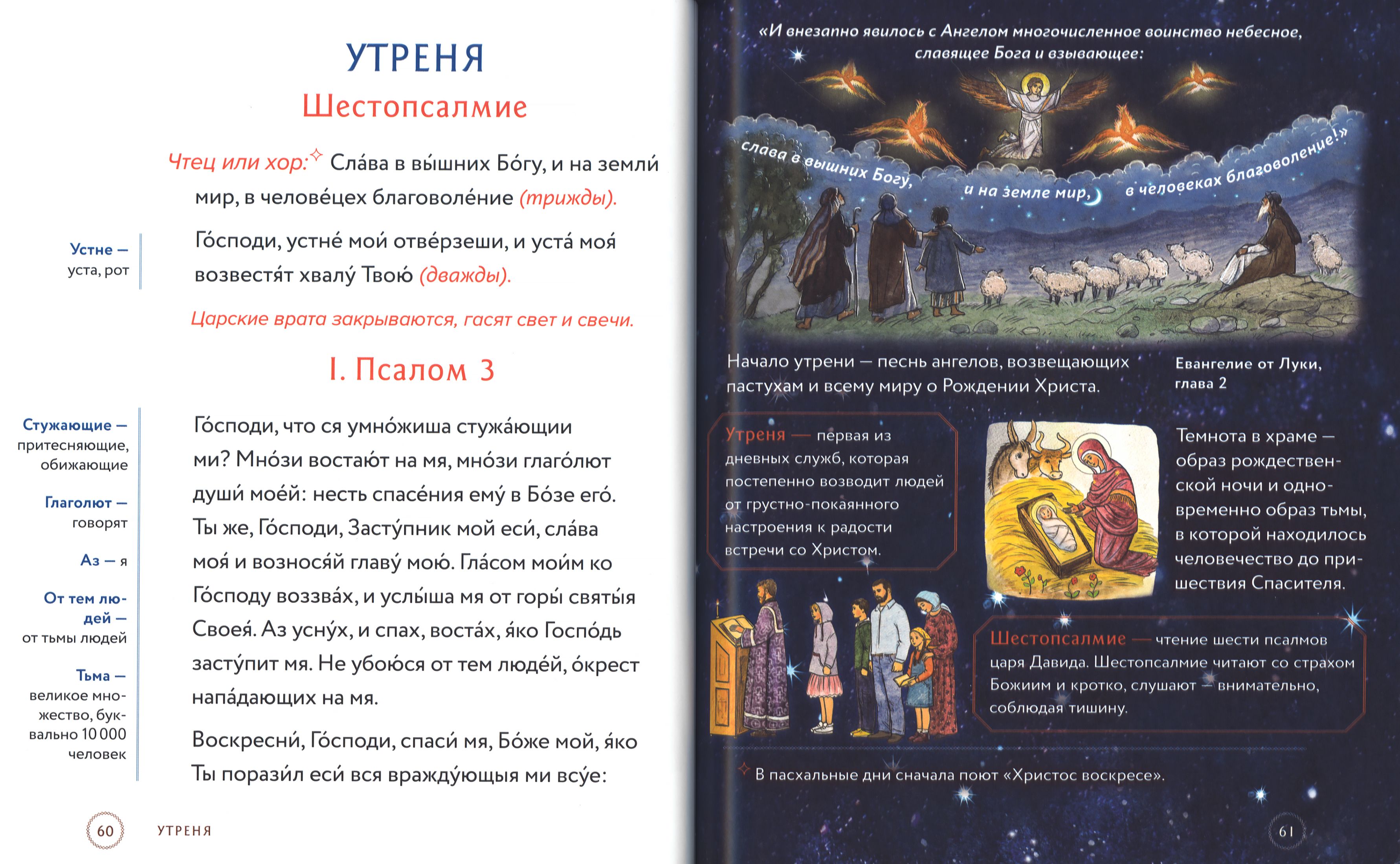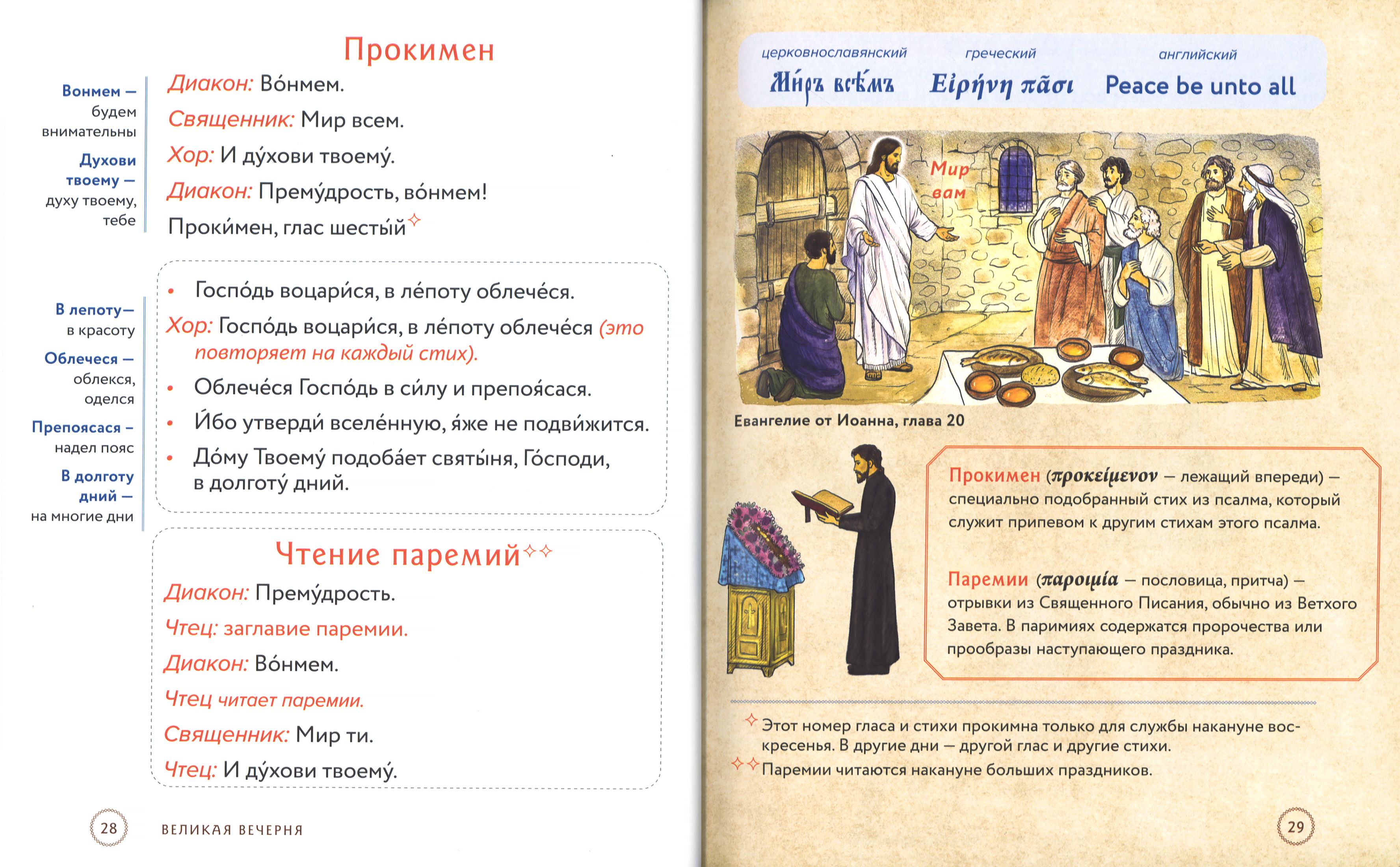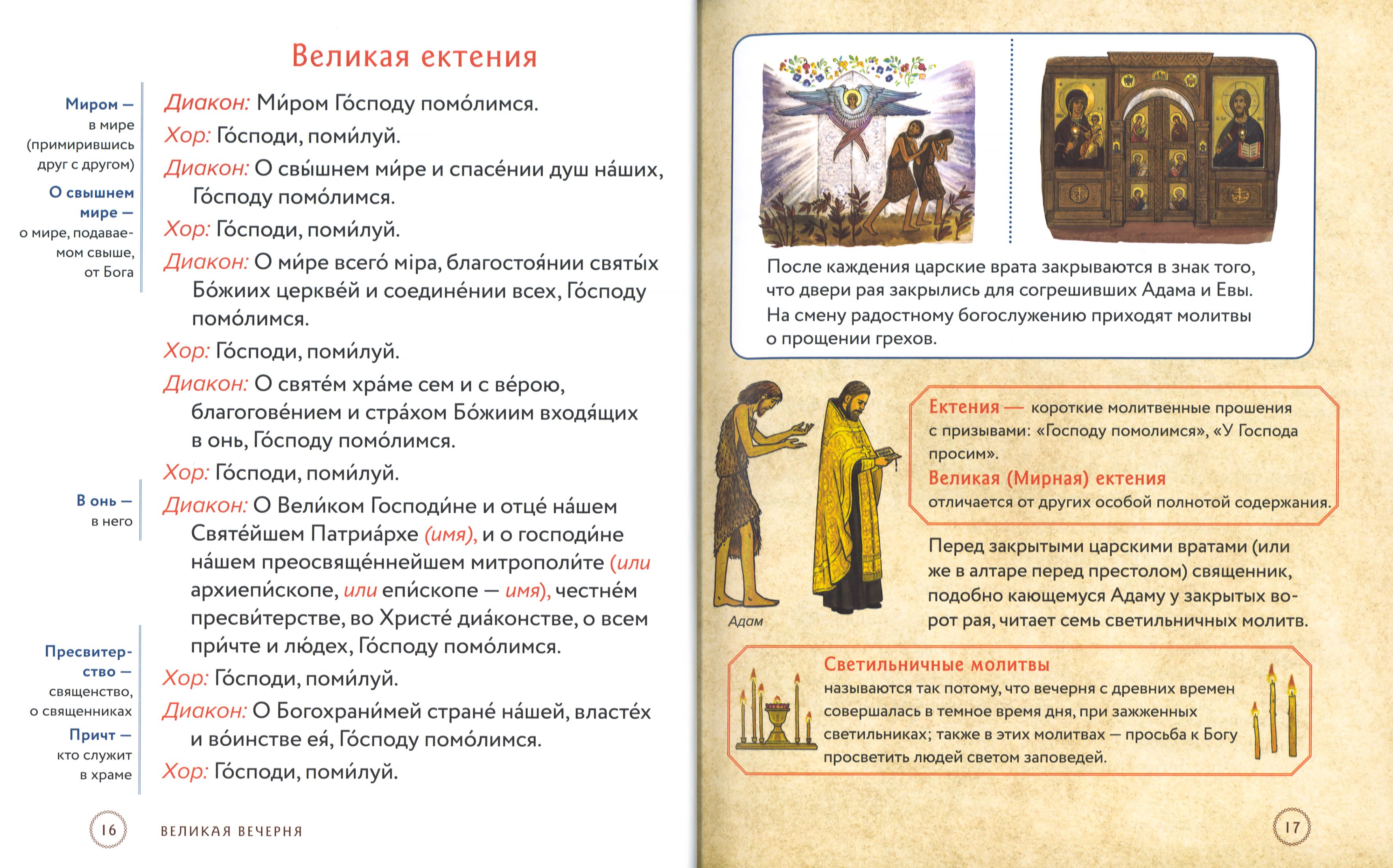 Полный текст служб, которые совершаются в храме вечером накануне воскресных и праздничных дней, набран крупным шрифтом – это позволяет следить за ходом богослужения. Из наглядных комментариев можно узнать: