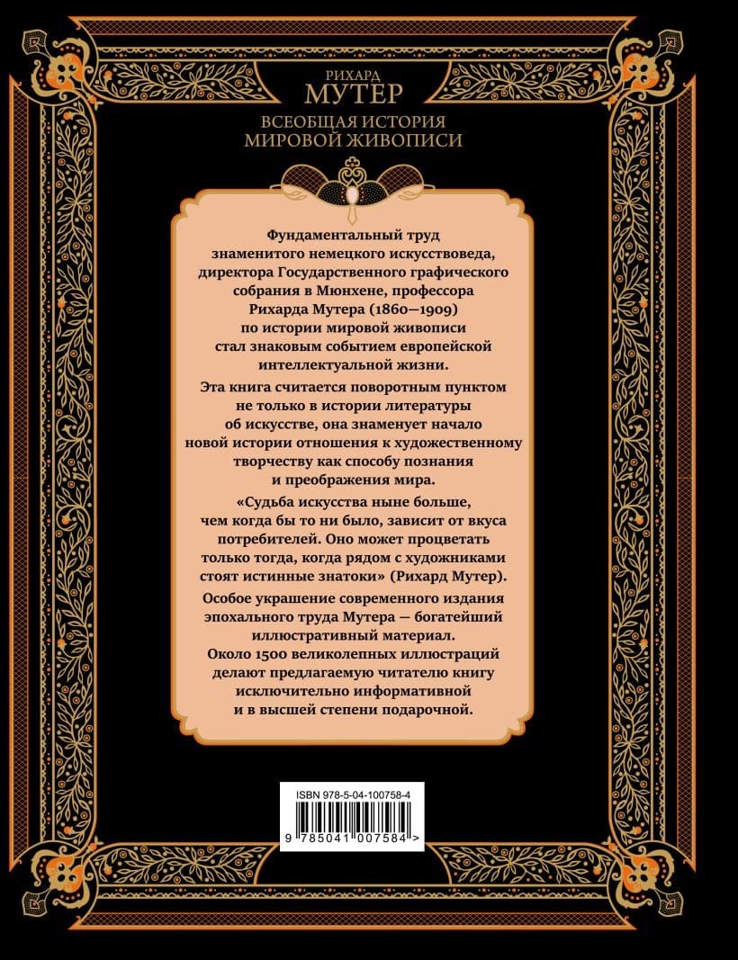 История живописи, насчитывающая тысячи лет, неотделима от истории развития цивилизации. Живопись — это вечный поиск совершенного образа ускользающего мира, в котором отражается сам человек, со всеми своими достоинствами и слабостями. Монументальный труд всемирно известного немецкого искусствоведа, профессора истории искусства Бреславльского (Вроцлавского) университета, директора Государственного графического собрания в Мюнхене Рихарда Мутера (1860—1909), собравшего поистине колоссальный материал по истории изобразительного искусства стран мира, — это возможность вновь пережить наиболее волнующие и запоминающиеся моменты вечного движения человечества к идеалу.
