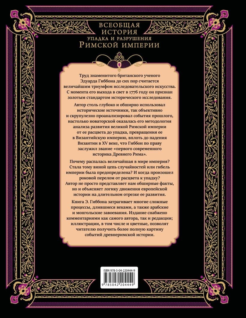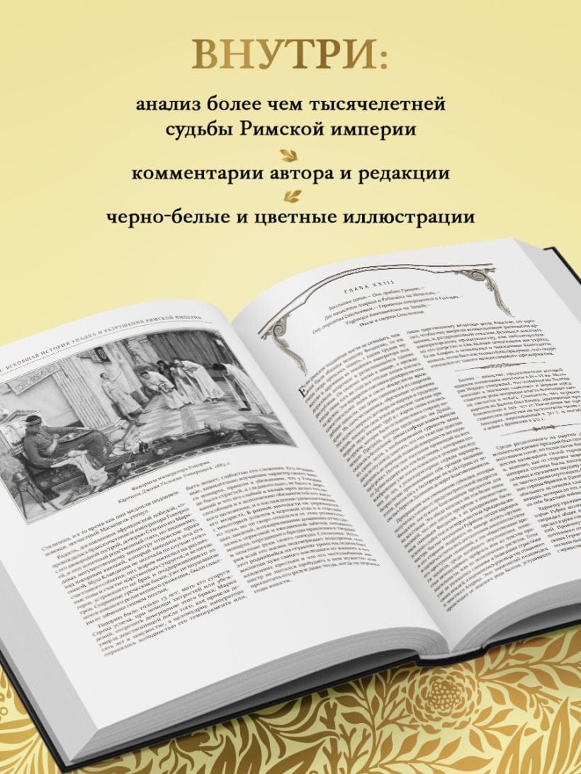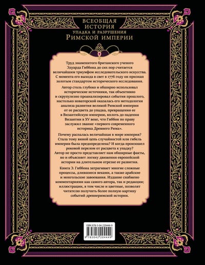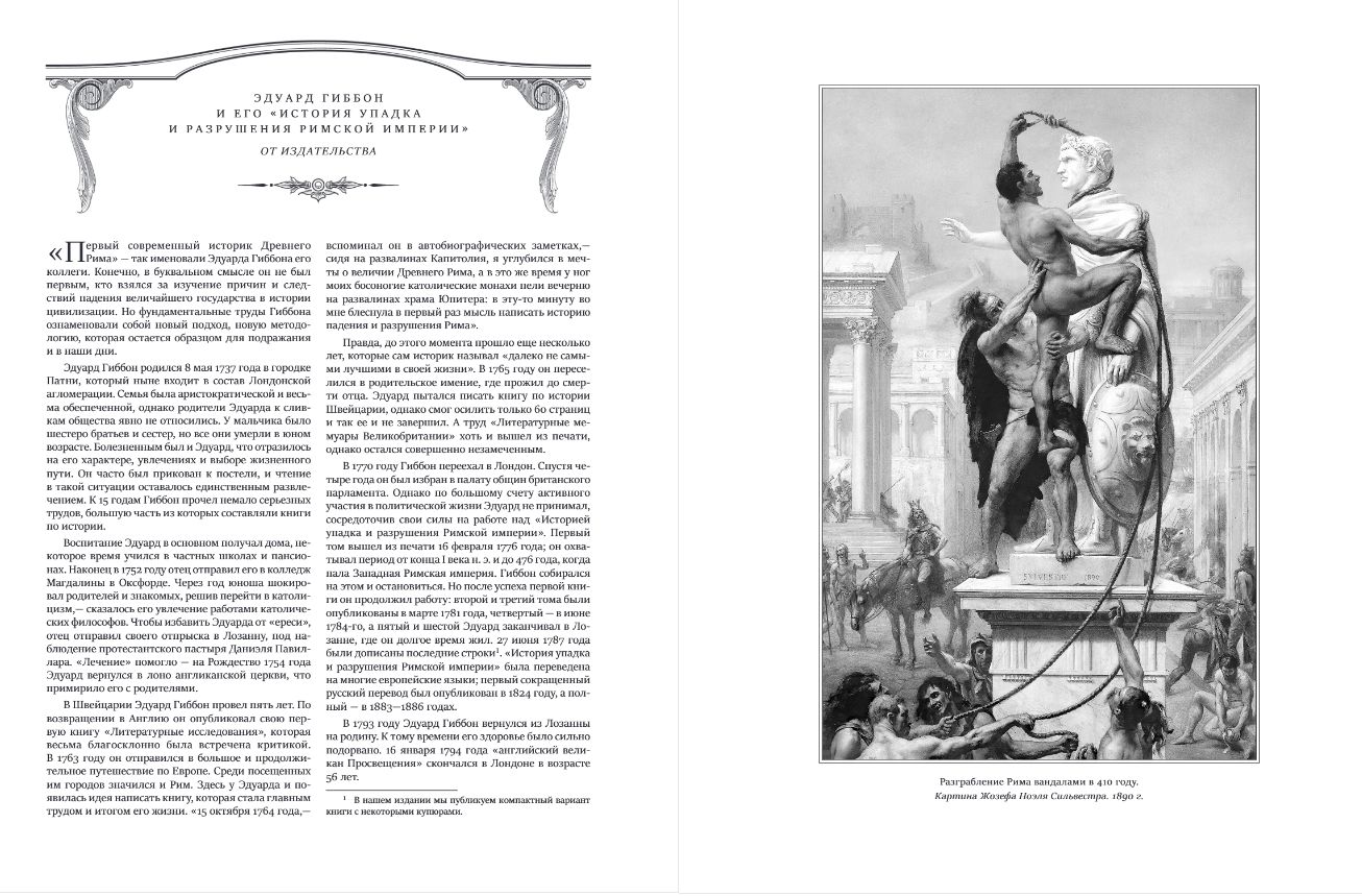 Фундаментальный труд Эдуарда Гиббона «История упадка и разрушения Римской империи» является одним из самых влиятельных и впечатляющих исторических произведений европейской литературы, прочно закрепившимся в общих представлениях об эпохе, которую по праву можно считать колыбелью европейской цивилизации. В фокусе исследования Гиббона — более чем тысячелетняя судьба римской цивилизации от «золотого века» империи при династии Антонинов до падения Константинополя под натиском осман в 1453 году.