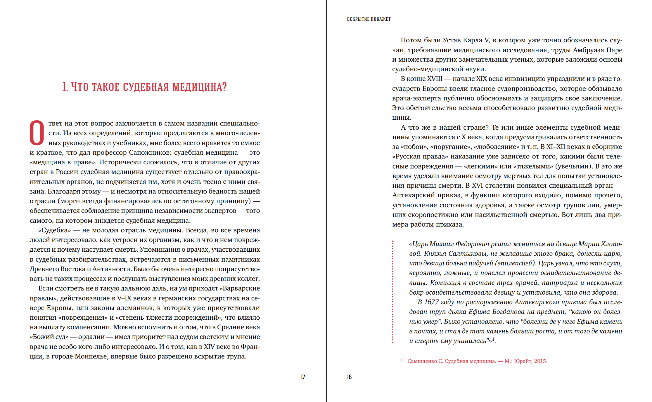 Это не учебник, хотя здесь вы найдете и краткий обзор становления судебной медицины, и основы судебно-медицинской экспертизы (например, как происходит осмотр тел на вызовах).