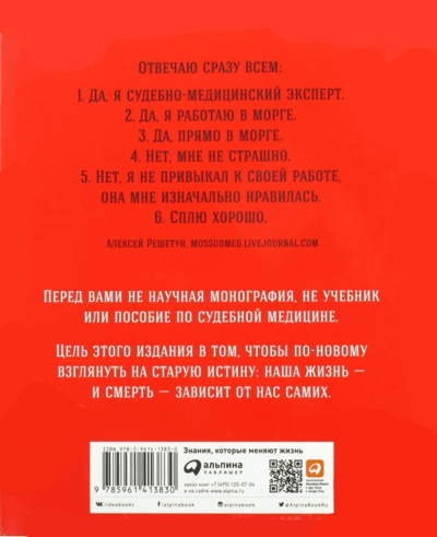 Судебно-медицинский эксперт Алексей Решетун (более известный как жж-блогер mossudmed) знаком со смертью не понаслышке. Он имеет с ней дело каждый рабочий день вот уже 17 лет: собственно, ее причины и есть объект его изучения. А значит, ему лучше, чем кому бы то ни было, известно, почему мы умираем и что не надо делать, чтобы не попасть до времени на секционный стол. Читатели его блога стремительно бросают курить, выпивать и начинают заниматься спортом.