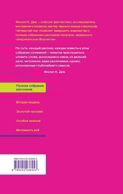 Филип К. Дик — классик научной фантастики, автор-новатор, который добавил жанру новое психоделическое измерение. Четвертый том полного собрания рассказов позволит завершить знакомство с произведениями малой формы писателя, которые, по словам самого Дика, были написаны в самые плодотворные годы его творчества.