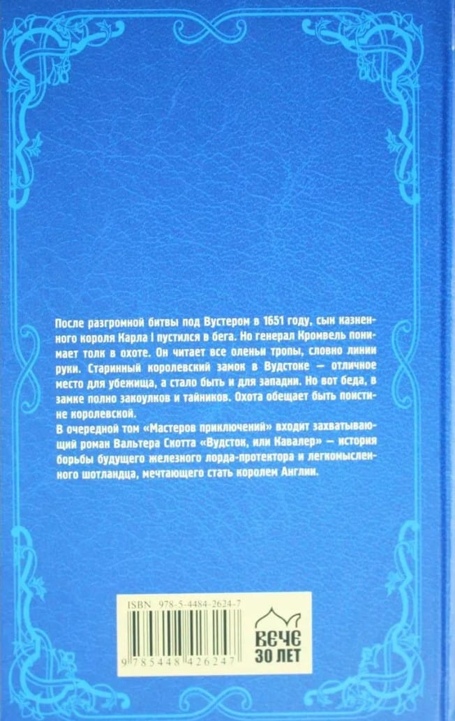 После разгромной битвы под Вустером в 1651 году, сын казненного короля Карла I пустился в бега. Но генерал Кромвель понимает толк в охоте. Он читает все оленьи тропы, словно линии руки. Старинный королевский замок в Вудстоке — отличное место для убежища, а стало быть и для западни. Но вот беда, в замке полно закоулков и тайников. Охота обещает быть поистине королевской. В очередной том «Мастеров приключений» входит захватывающий роман Вальтера Скотта «Вудсток, или Кавалер» — история борьбы будущего железного лорда-протектора и легкомысленного шотландца, мечтающего стать королем Англии.
