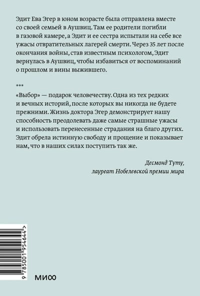 Одна из самых сильных книг о войне и внутренней силе человека. В 1944 году шестнадцатилетняя балерина Эдит Эгер была отправлена вместе со своей семьей в Аушвиц. Спустя всего несколько часов после гибели ее родителей нацистский доктор Йозеф Менгеле заставил Эдит танцевать ради собственной забавы и ее выживания. Эдит и ее сестра пережили все ужасы Аушвица, Маутхаузена и Гунскирхена — лагерей смерти. 4 мая 1945 года Эдит, едва живую, достали из кучи трупов. Пытки, голод и постоянная угроза смерти не сломили Эдит, а ее внутренний мир помог обрести жизнеутверждающую силу и душевную свободу. Через 35 лет после окончания войны, став известным психологом, Эдит вернулась в Аушвиц, чтобы избавиться от воспоминаний о прошлом и вины выжившего. Эдит чередует события своего личного путешествия с трогательными историями тех, кому сама помогла излечиться. Эта книга — незабываемая история выживания и исцеления, история освобождения и силы человеческого духа. Она показывает, что мы всегда можем выбирать, чему нас учит жизнь и как относиться к происходящему. Это книга, которая изменит жизнь и подарит поколениям читателей поддержку.