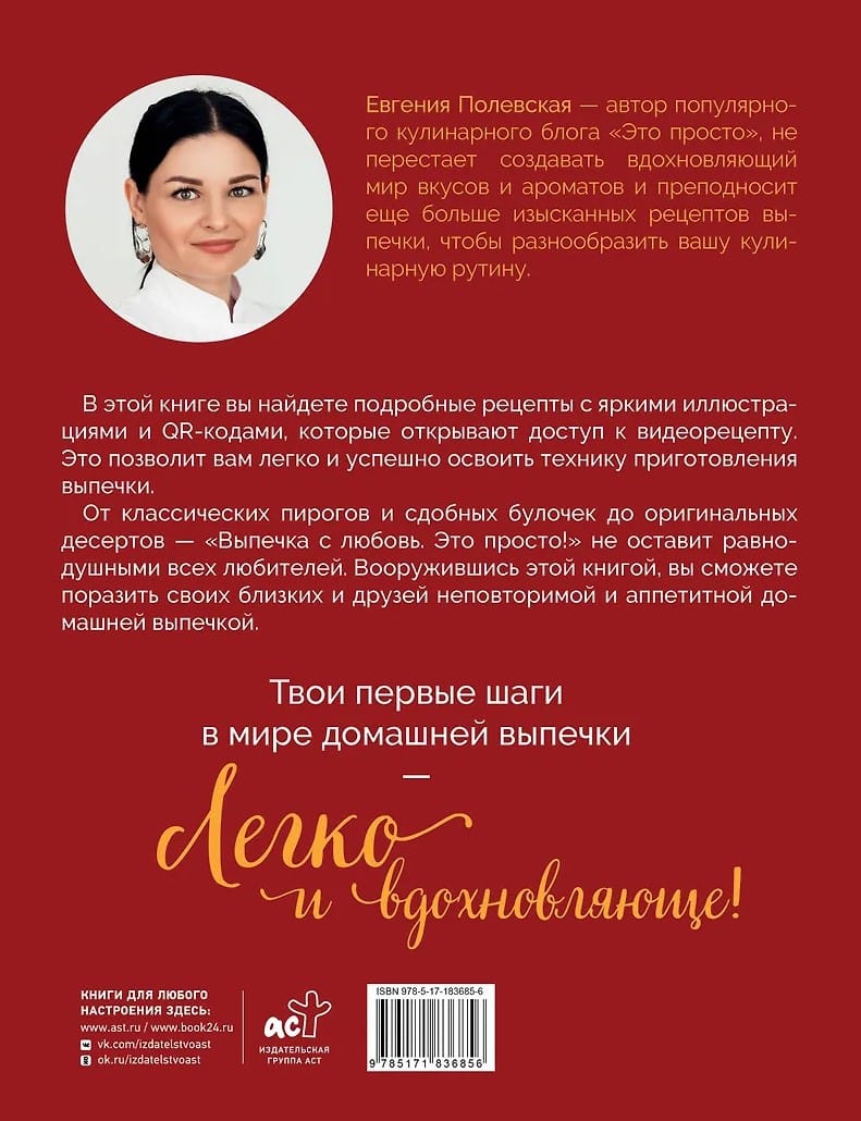 В этой книге вы найдете подробные рецепты c яркими иллюстрациями и QR-кодами, которые открывают доступ к видеорецепту. Это позволит вам легко и успешно освоить технику приготовления выпечки. От классических пирогов и сдобных булочек до оригинальных десертов — «Выпечка с любовь. Это просто!» не оставит равнодушными всех любителей. Вооружившись этой книгой, вы сможете поразить своих близких и друзей неповторимой и аппетитной домашней выпечкой.