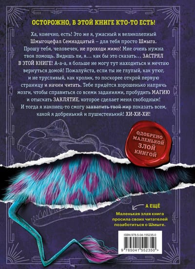 Если ты думаешь, что книги — это что-то скучное, то у меня для тебя БОЛЬШО-О-ОЙ сюрприз! Ведь в этой книге живёт самое необычное, великолепное и ужасное существо на свете! Ну, то есть я — Шмыгоцефал Семнадцатый, или просто Шмыга. Мне очень нужна помощь умного, смелого и желательно ВСЕМОГУЩЕГО читателя. А всё потому, что я… ЗАСТРЯЛ! Я больше не могу сидеть в этой книге и хочу домой! Конечно, тебе придётся постараться и пройти самый настоящий квест, пробудить магию и найти мощное заклятие, чтобы освободить меня. Но я уверен: вместе мы справимся!
