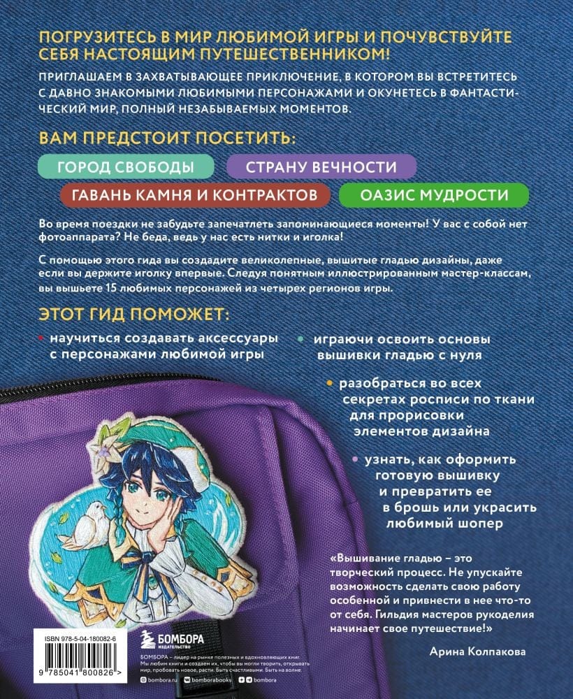Откройте для себя удивительные уголки Города свободы, Гавани камня и контрактов, Страны вечности и Оазиса мудрости, отправившись в незабываемое путешествие в компании любимых героев. Вам предстоит учинить небольшой погром вместе с Рыцарем Искоркой и пообедать с дружелюбным Хранителем очага. Наследник багрового Они предложит принять участие в жучином бою, а Странствующий фенек проведет экскурсию по густым джунглям. Чтобы запечатлеть все запоминающиеся моменты, фотоаппарат вам не понадобится — достаточно будет лишь нитки и иголки! С помощью этой книги вы создадите великолепные вышитые гладью дизайны, даже если вы держите иголку впервые. Следуя понятным иллюстрированным мастер-классам, вы вышьете 15 любимых персонажей из четырех регионов игры Геншин.