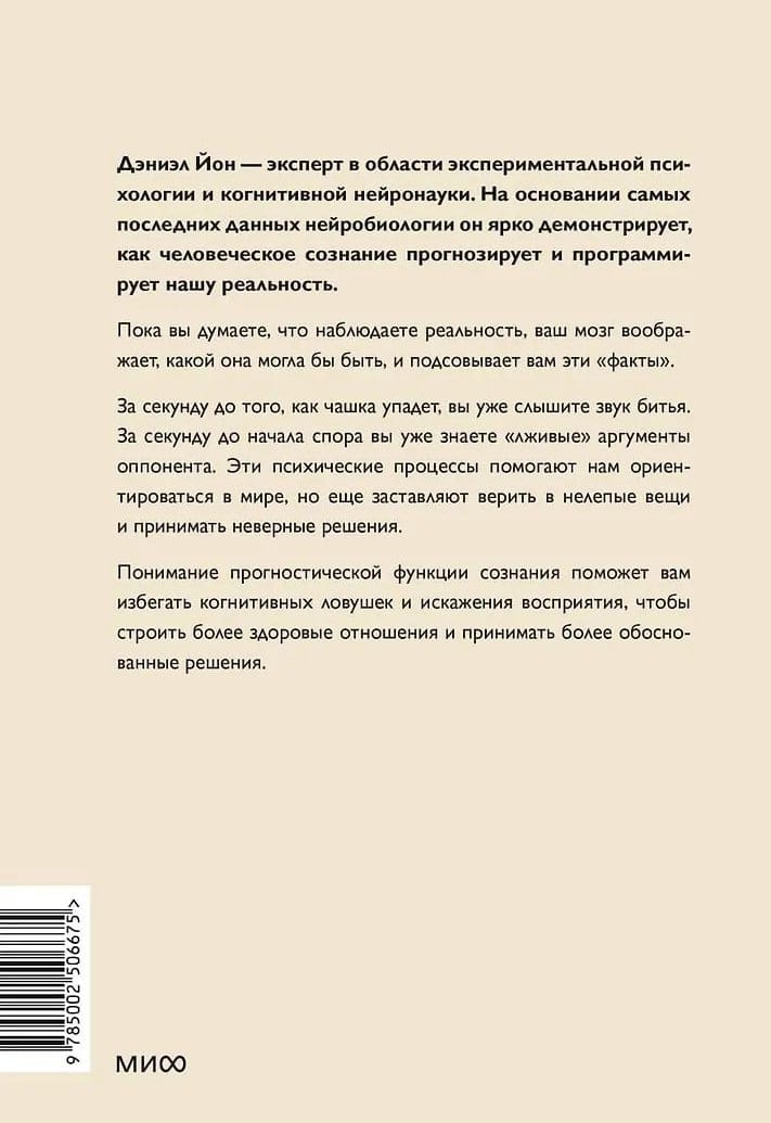 Ваш мозг объясняет мир или галлюцинирует?.. Пока вы думаете, что наблюдаете реальность, мозг воображает, какой она могла бы быть, — и подсовывает вам эти «факты». Дэниел Йон — эксперт в области когнитивной нейронауки. На основании самых последних данных нейробиологии он ярко демонстрирует, как человеческое сознание прогнозирует и программирует нашу реальность.