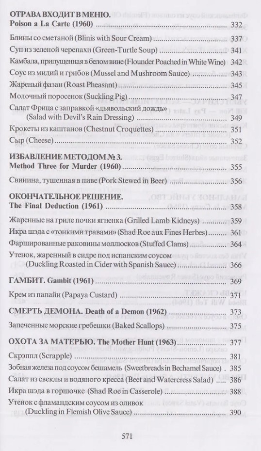 Занимательное, поучительное, живое пособие по интернациональной кулинарии, в котором приведены рецепты блюд, взятых из историй о Ниро Вульфе, великом сыщике и величайшем чревоугоднике. Вы убедитесь, что они не так сложны по составу ингредиентов и технологии приготовления, как их интригующе-загадочные названия. Так что попробуйте и вы приобщиться к кулинарным тайнам повара Фрица Бреннера и разнообразьте ваше меню новыми блюдами.