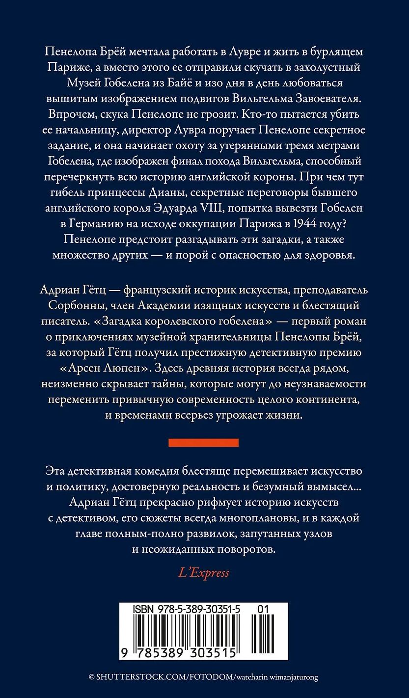 Адриан Гётц — известный французский историк искусства, преподаватель Сорбонны, член Академии изящных искусств, директор библиотеки Мармоттан при Академии и блестящий писатель. «Загадка королевского гобелена» — первый роман о приключениях музейной хранительницы Пенелопы Брёй, за который Гётц получил престижную детективную премию «Арсен Люпен» (2007). Здесь древняя история всегда рядом, неизменно скрывает тайны, которые могут до неузнаваемости переменить привычную современность целого континента, и временами всерьез угрожает жизни.